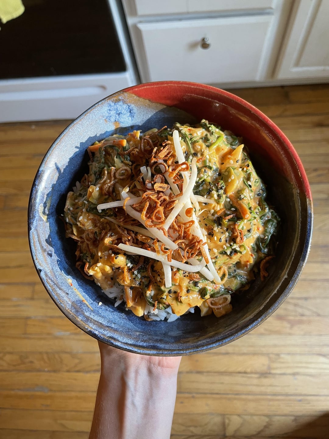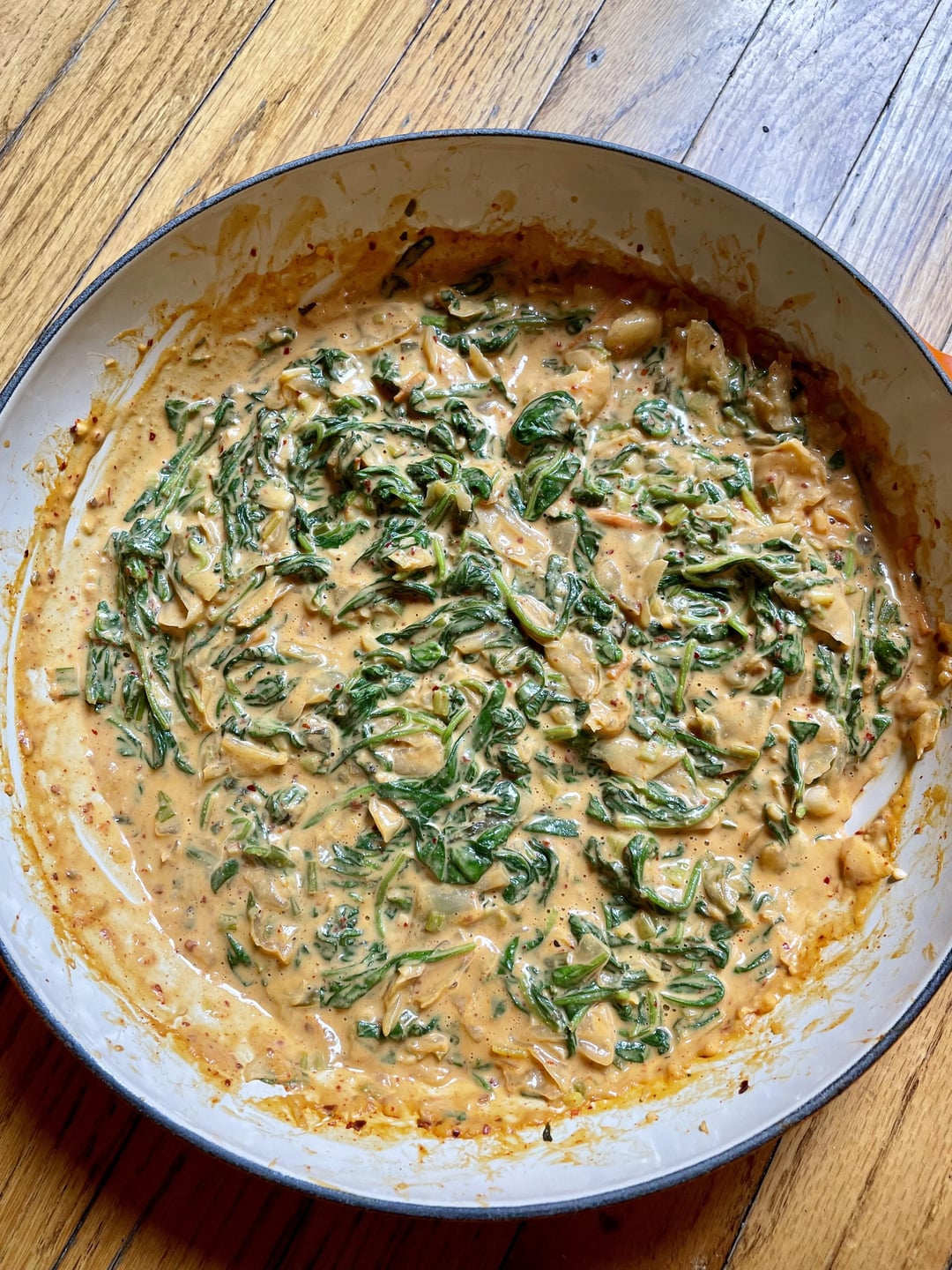 3. Lower heat to low. Then add cashew cream, coconut aminos, gochugaru, sweetener, and nutmeg if using. Stirring to combine. Salt to taste.