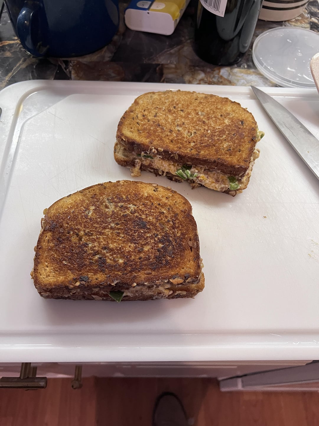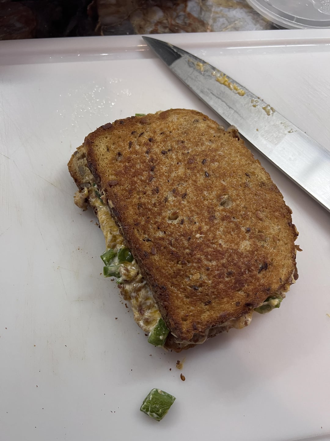 3 jalapeños diced. 1 shallot diced. Sauté them with some bacon bits. Then I mixed them with whipped cream cheese and shredded sharp cheddar. Spread it on the buttered bread and let it do its thing like you would a normal grilled cheese sando.