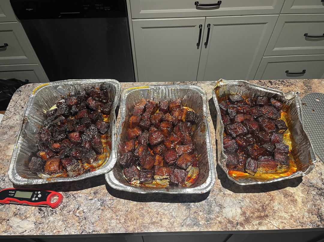 Moved to clean aluminum pans and sauced 2 of the 3 with my own bbq sauce, and the third with gochujang.