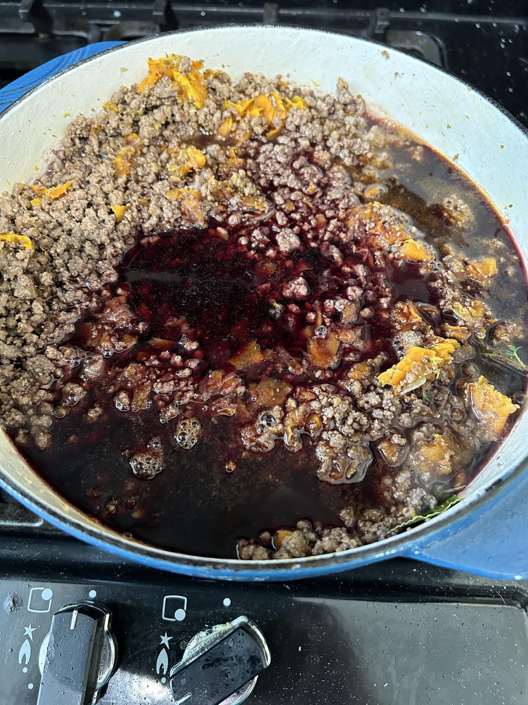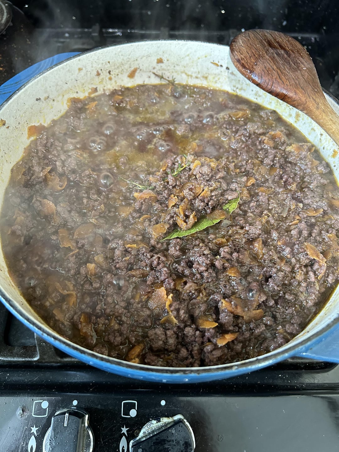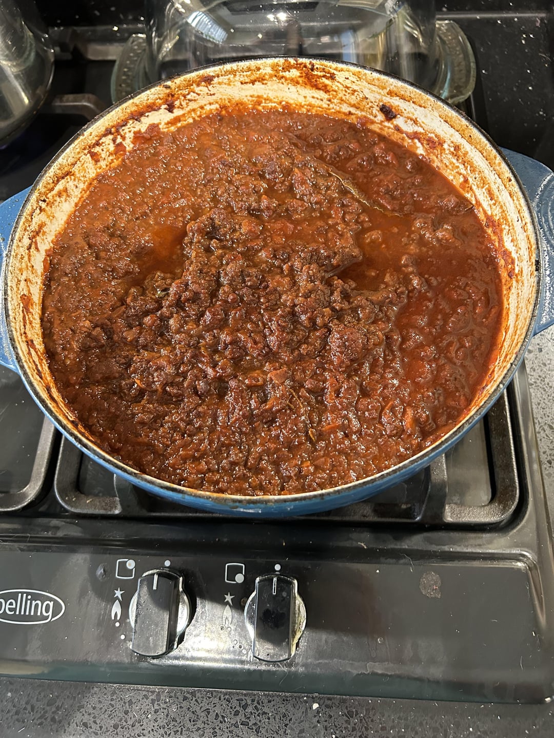 I followed Marco Pierre White’s ragu recipe: fry off the beef, grate onion + carrot + celery and fry that off. Combine and add red wine. Reduce the wine down and then add passata. Oven, gas mark 2 for 90 mins.