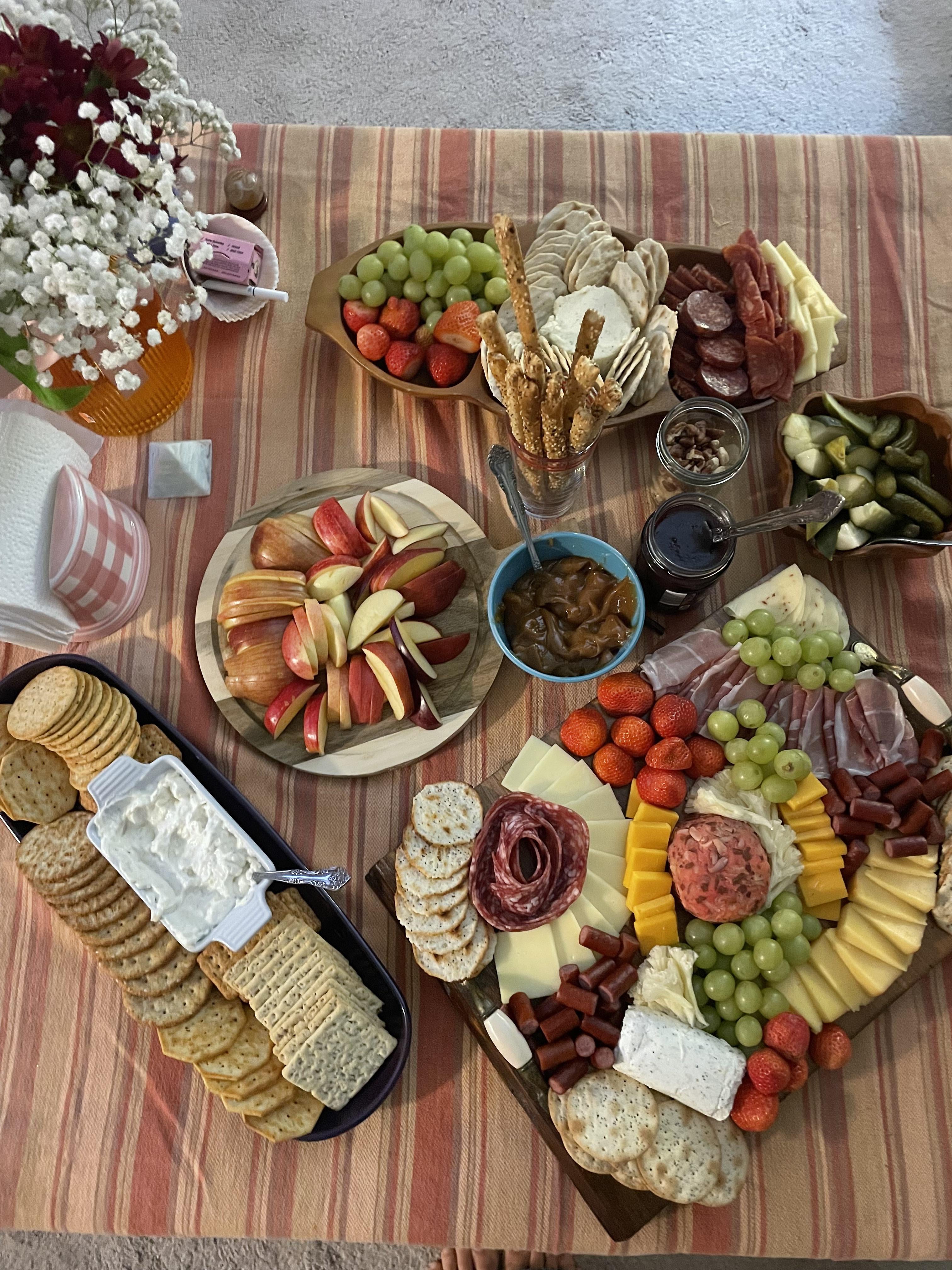 Love tablecloth and fresh flowers. Baby’s breath compliments. Love how you did it in sections with separate plates.