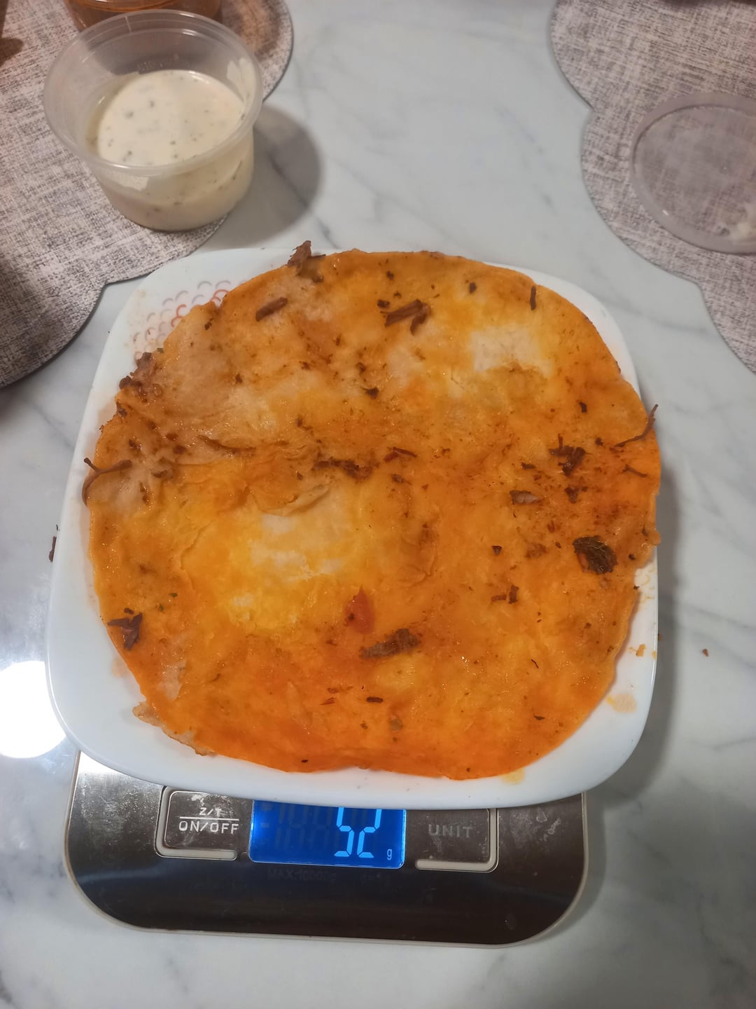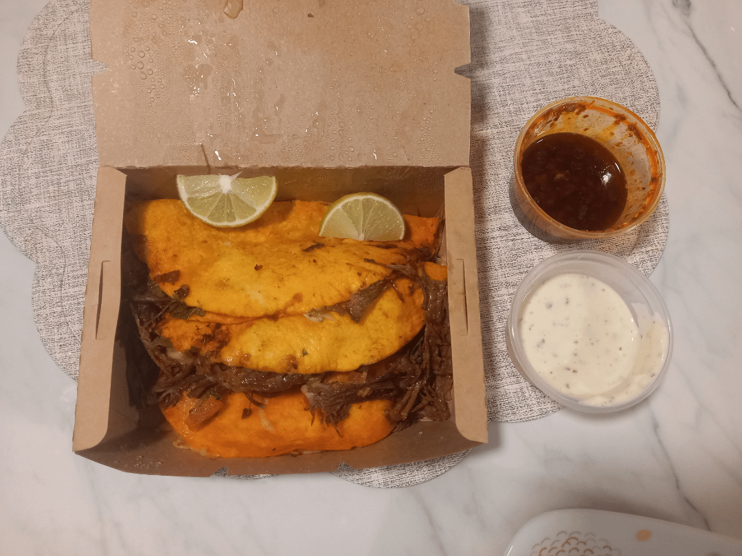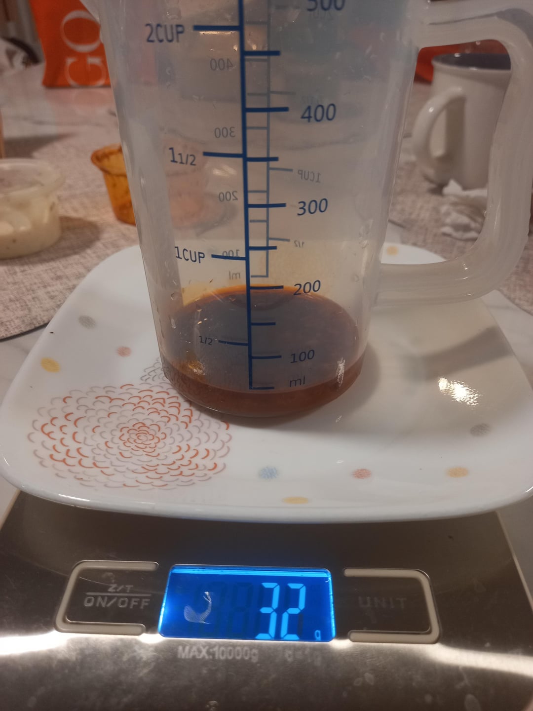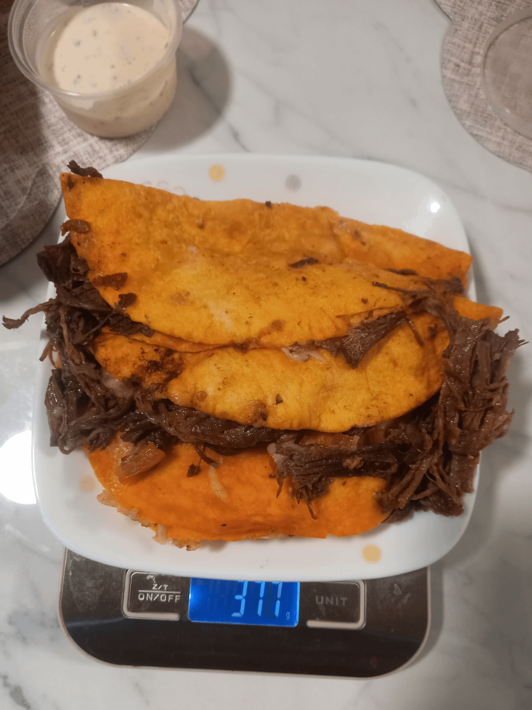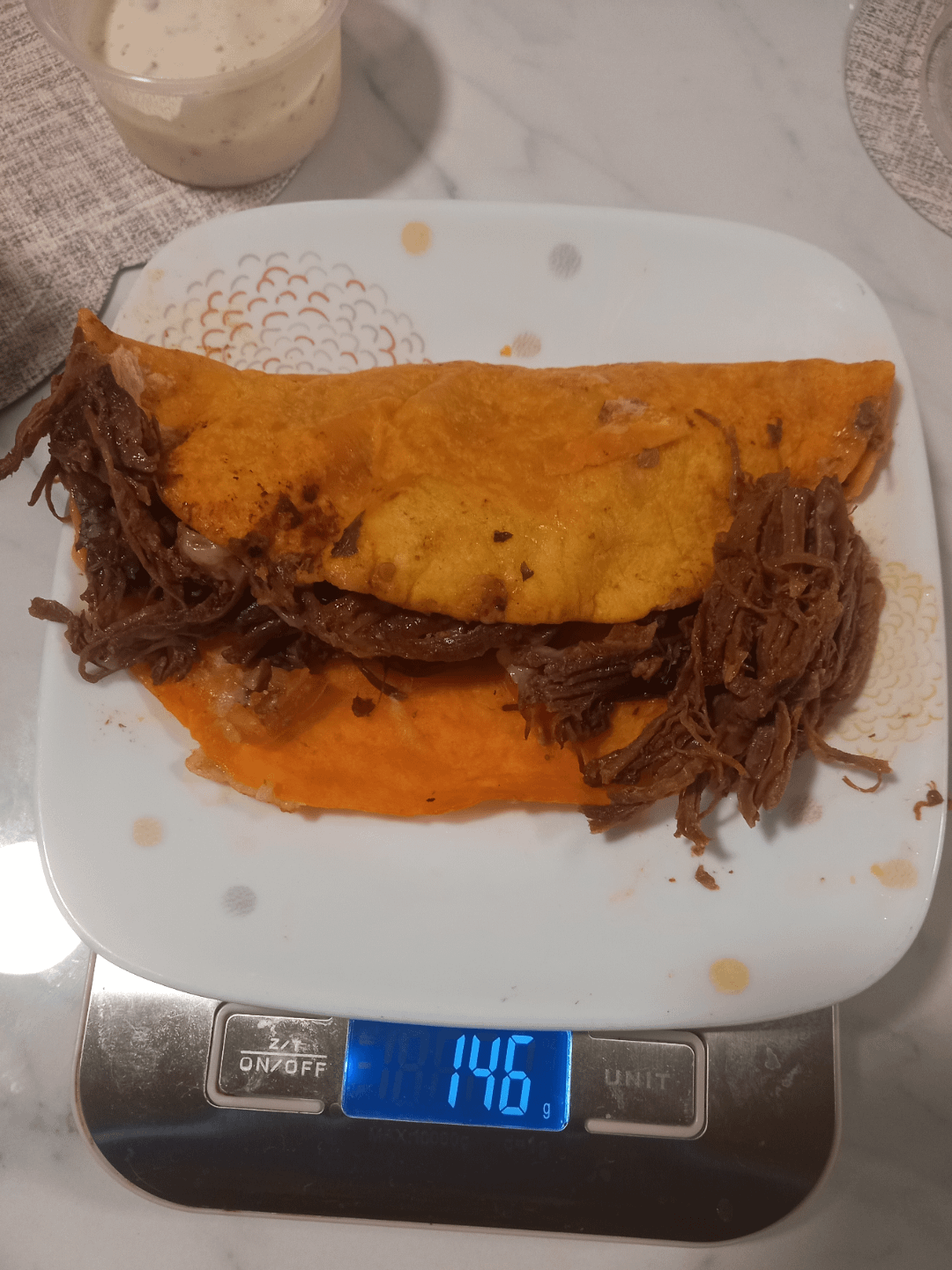 3 for 377g, the heaviest is 146g. Counting from the heaviest) Tortilla dipped in birria oil is 52g, meat + cheese + onions, tomatoes and cilantro is 96g. Sour cream (?? With herbs??) Is about 4 tbsp and less than 50mls, consomme is 32g and barely less than 50mls too.