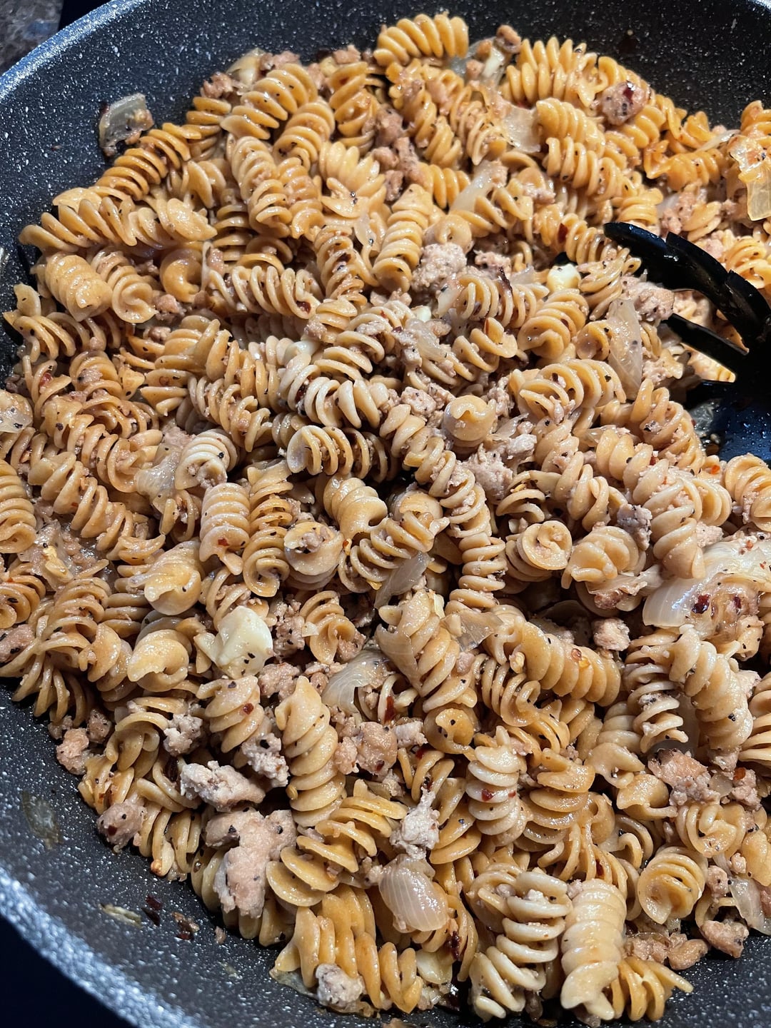 Pasta whole wheat with ground turkey with tons of onions n garlic. Came out pretty good.