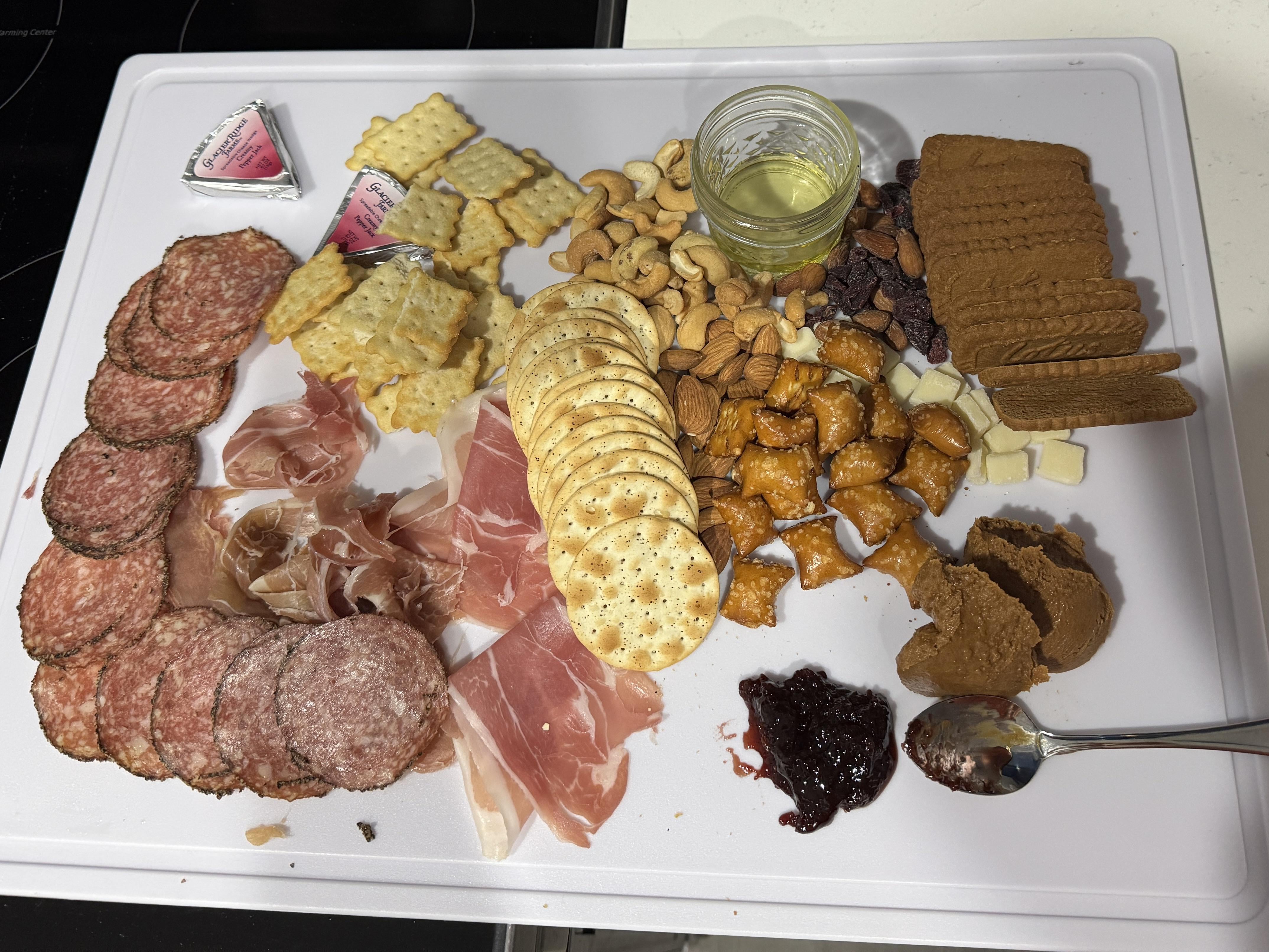 Peppered Salami and pepper jack spread, prosciutto, chicken crackers, sesame crackers, cashews, almonds, raisins, peanut butter filled pretzels, some sour cherry jam, Biscoff Butter, some white American cheese, and some biscoff cookies. The jar is some black truffle oil.