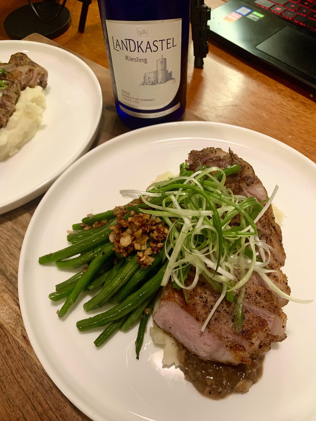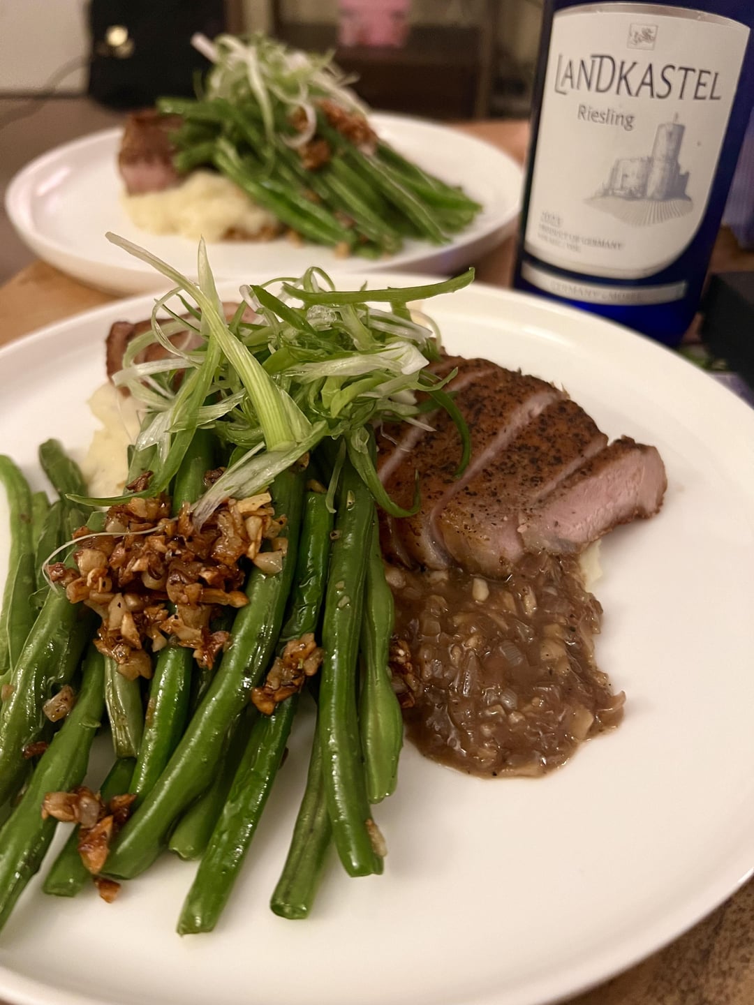 For sides I did a mash potato with russet potatoes, milk & Irish butter and pan seared green beans with crispy garlic. I saw a chef from CCW do a tutorial on slicing green onions into ribbons really fast, so I tried that out and used them for garnish! We had a Riesling from Aldi to pair with dinner too because why not. 😋