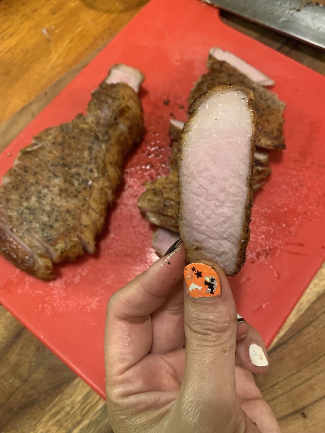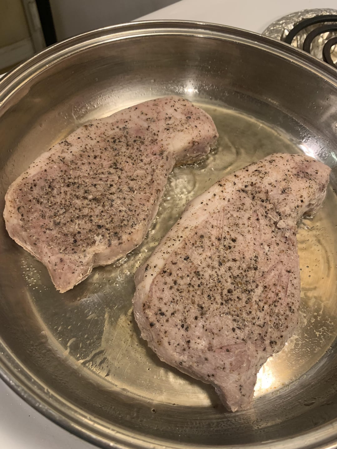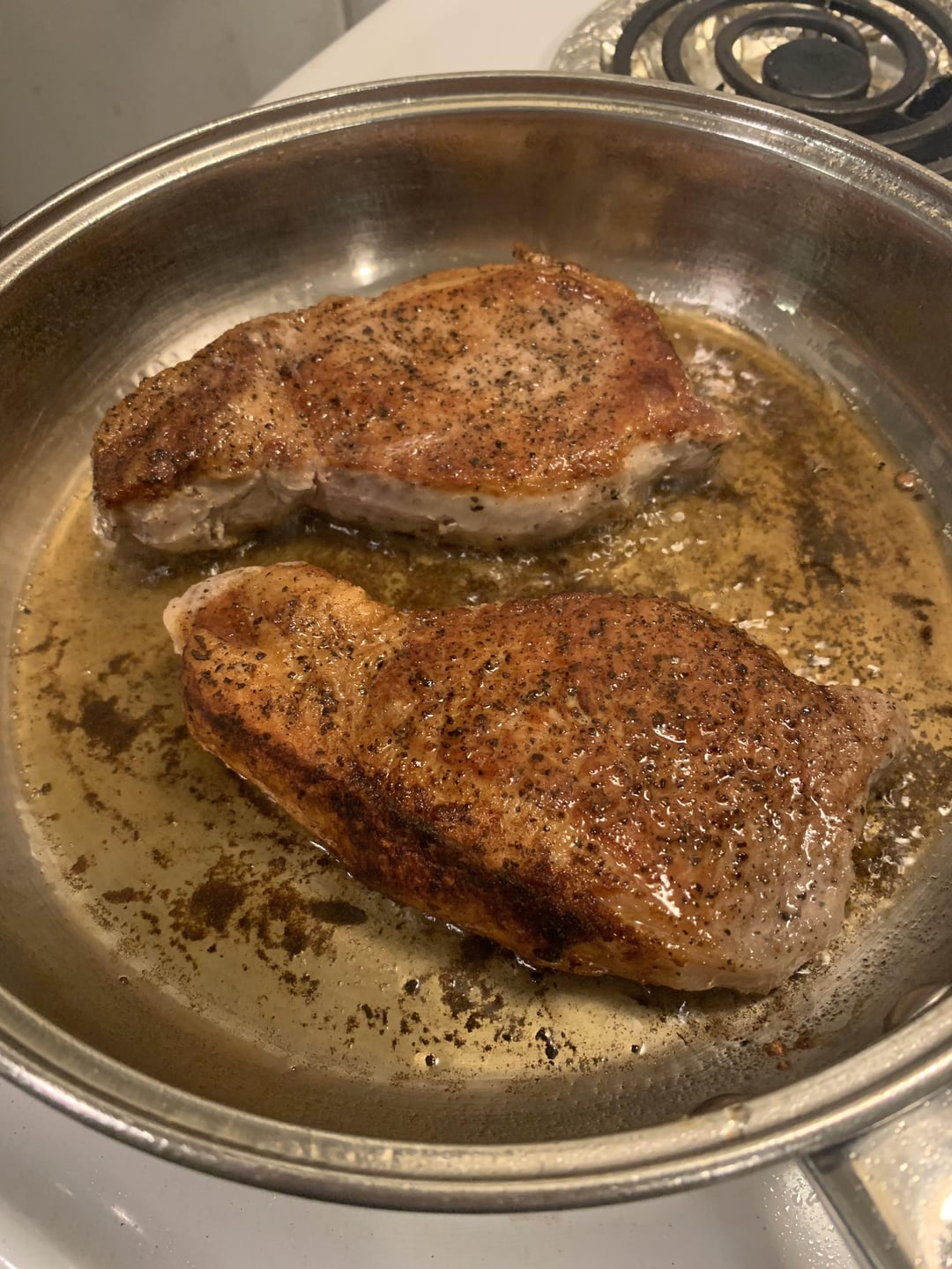 I used locally sourced pork chops seasoned with just salt, pepper, and fresh rosemary at 137F for 2.5 hours. I seared them in a stainless steel pan with canola oil after an ice bath and patting dry, then made a pan sauce with shallots, garlic, red wine vinegar, leftover juice from the sous vide bags, butter, and cornstarch. The cuts are a bit uneven but I’m very pleased with how the sear turned out! (I’ve been notorious for having a very weak sear game in the past so sometimes making steaks scares me still 😂)