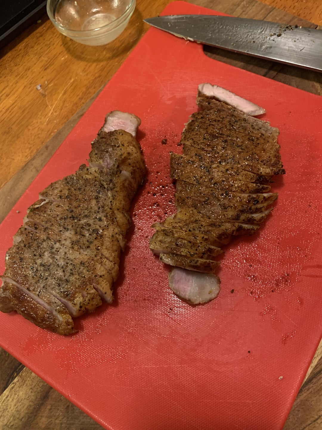Nice work. I do mine at 135F and cut them a bit thicker to make sure I can sear sufficiently and still have a good amount of unseared thickness.