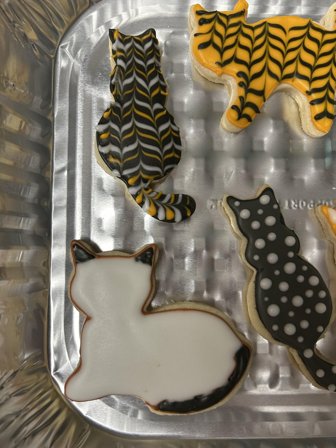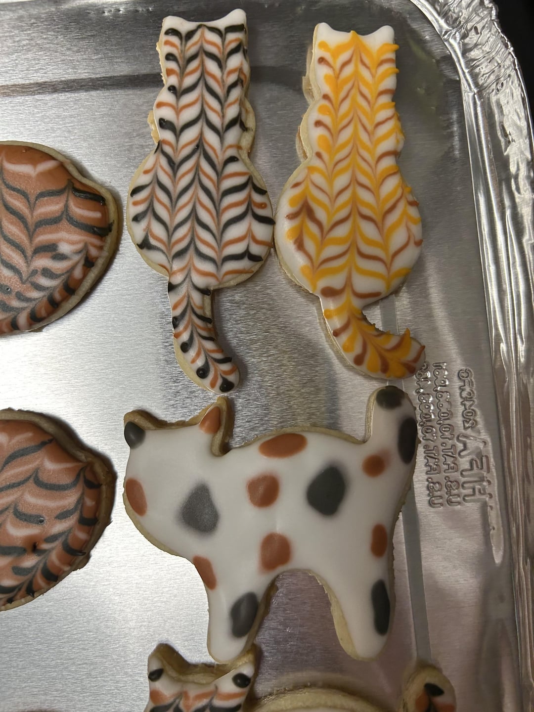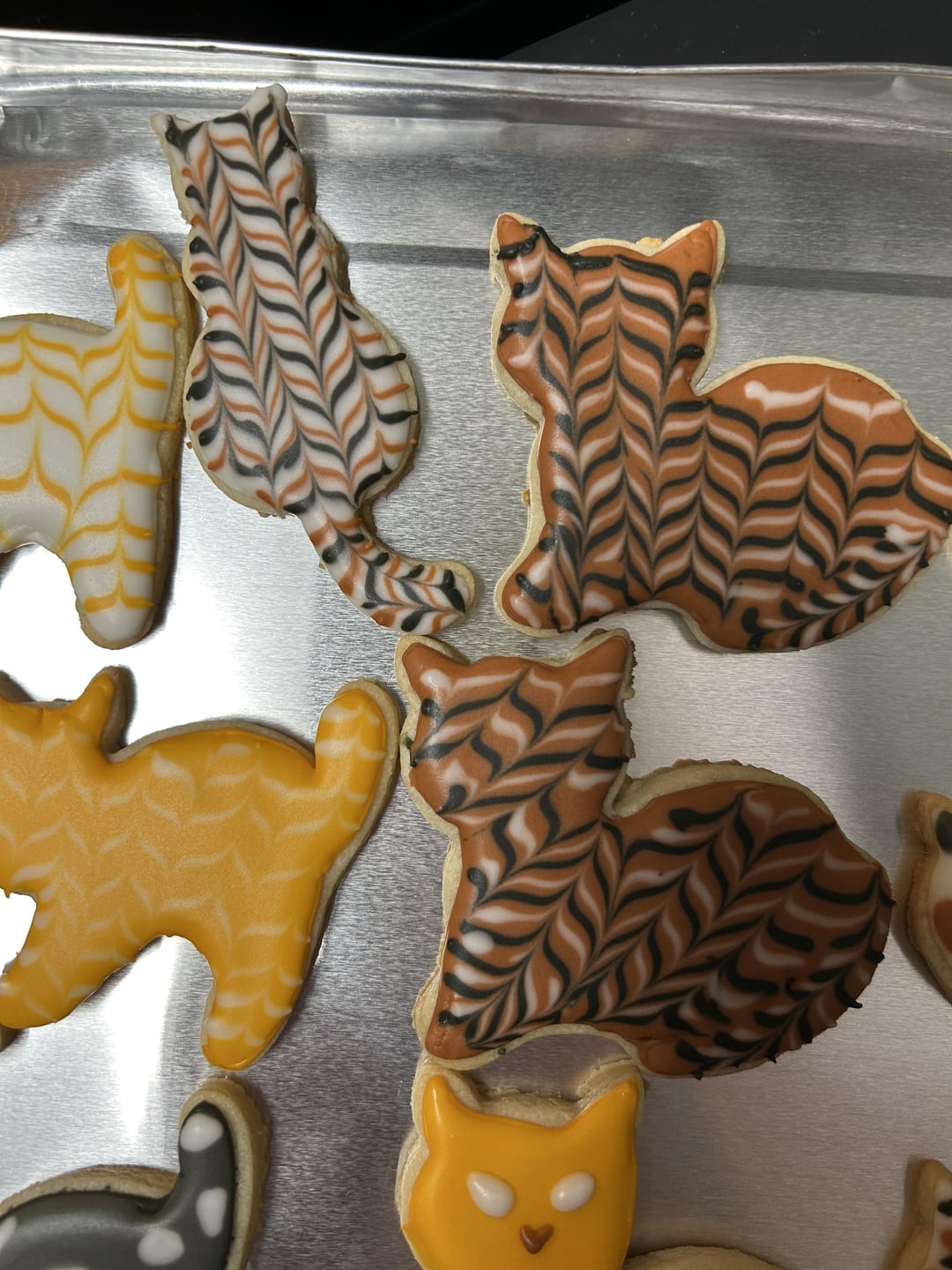 I have gone to two in person classes where they make the cookies and royal icing for you. This was my second time trying at home. The first time (a couple weeks ago), I definitely didn’t get the royal icing texture correct at all. This time, I think I did much better with it. Added a bit too much water to the black (so it was more gray and too runny). But everything else went pretty well! Hoping to try some more designs soon. Any online courses you’d recommend?