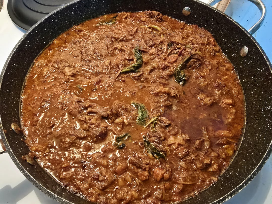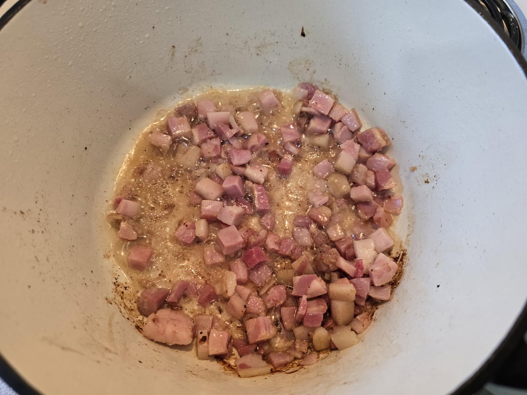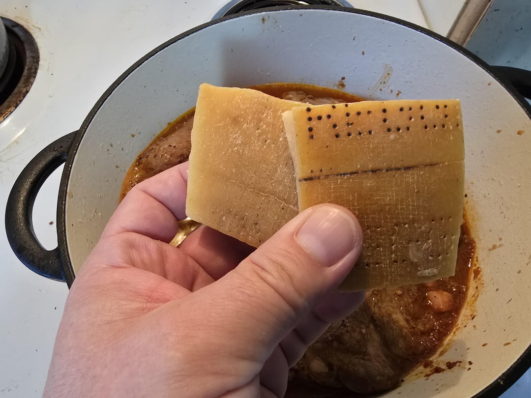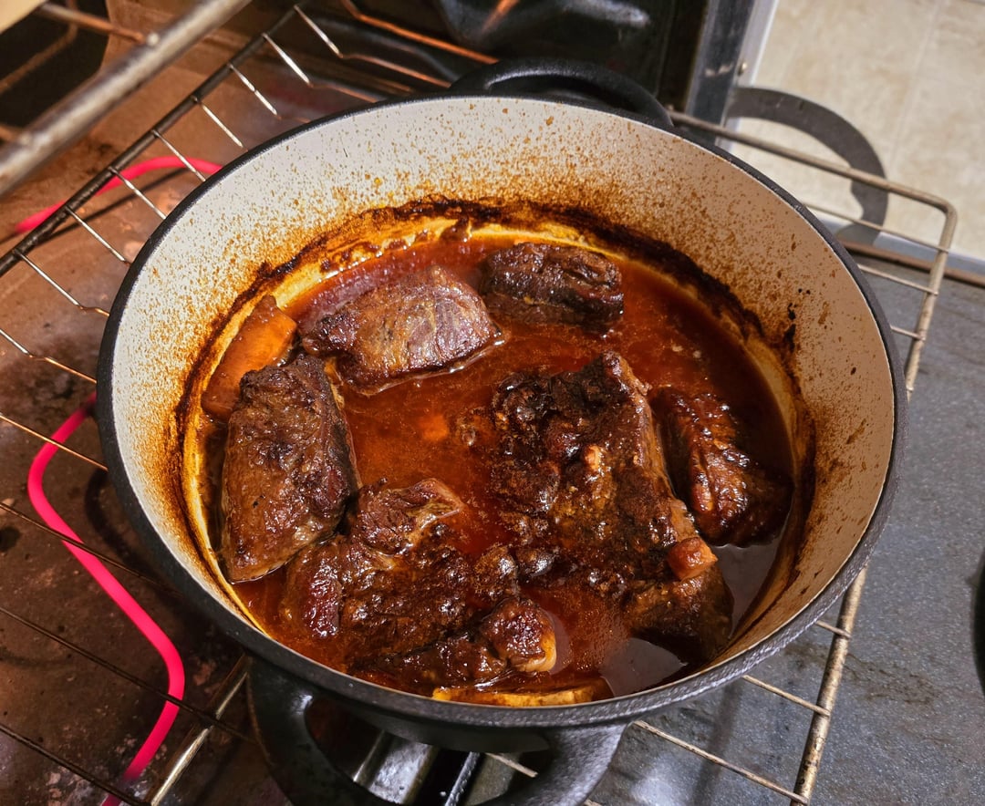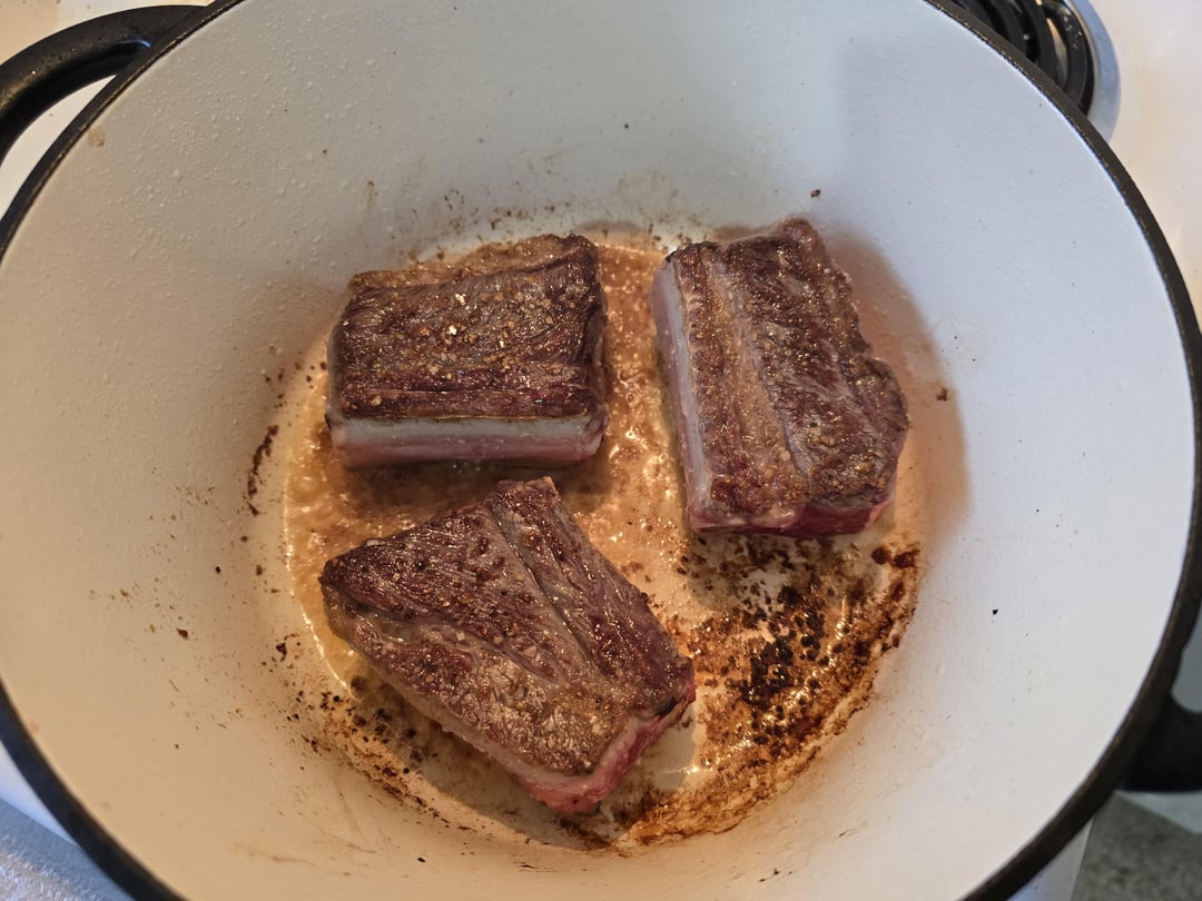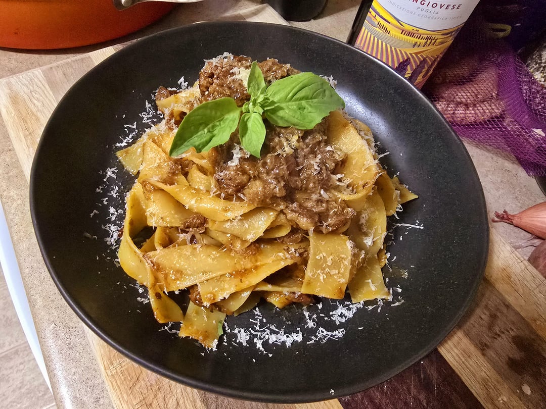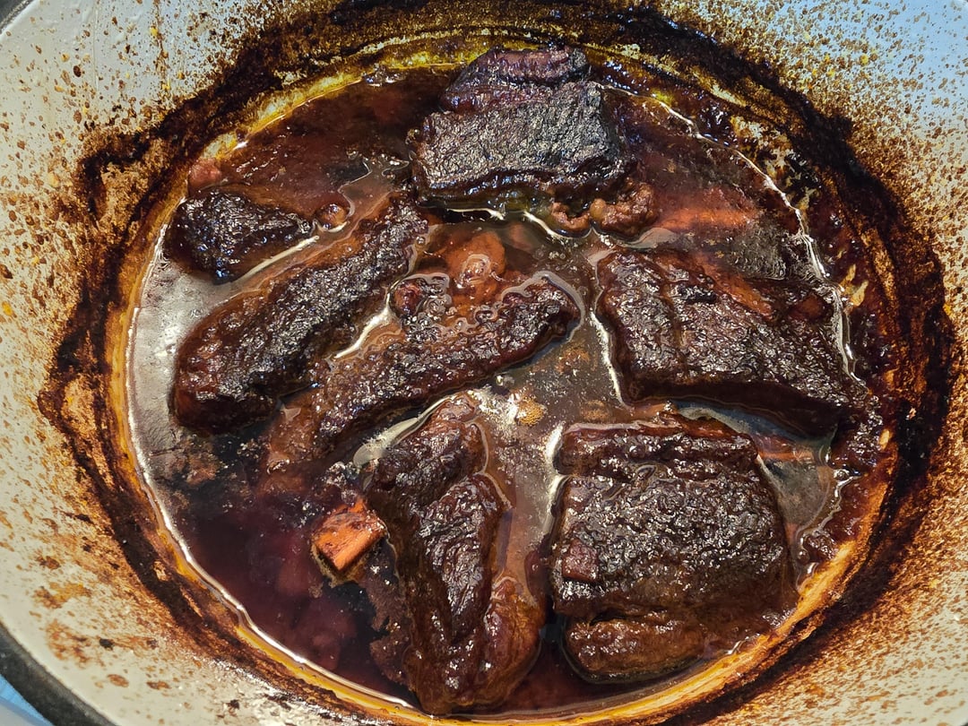 Seared off the meat after hitting it with the ol S&P. Browned up the pancetta. Added sofrito that I chopped super fine in the food processor. Cooked out most of the moisture, added tomato paste. Cooked that for a few minutes. Added wine, a couple parm rinds, stock, and a few cubes of frozen homemade demi glace. Meats go back in, bring to a simmer, into the oven at 300f. Cook until the ribs are probing nice and tender. Into the fridge over night. Pull off the fat layer, bring back up to temp. Remove bones and membranes, shred the meat. Add fresh basil, simmer half an hour or so. Check seasoning. If you’ve been seasoning at each step, you shouldn’t need to adjust much at this point. Remove the basil. Cook the noods of your choice. A short, tubular pasta like rigatoni or paccheri would be great, but pappardele is a classic. Toss it all up, hit it with a little good olive oil and fresh grated parm, consume with great enthusiasm.