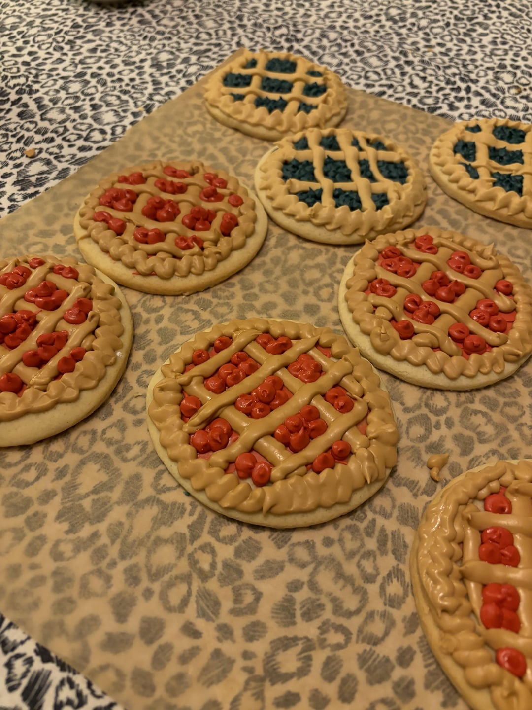 I made some thanksgiving inspired autumn cookies today, pumpkin, cherry and blueberry pies.