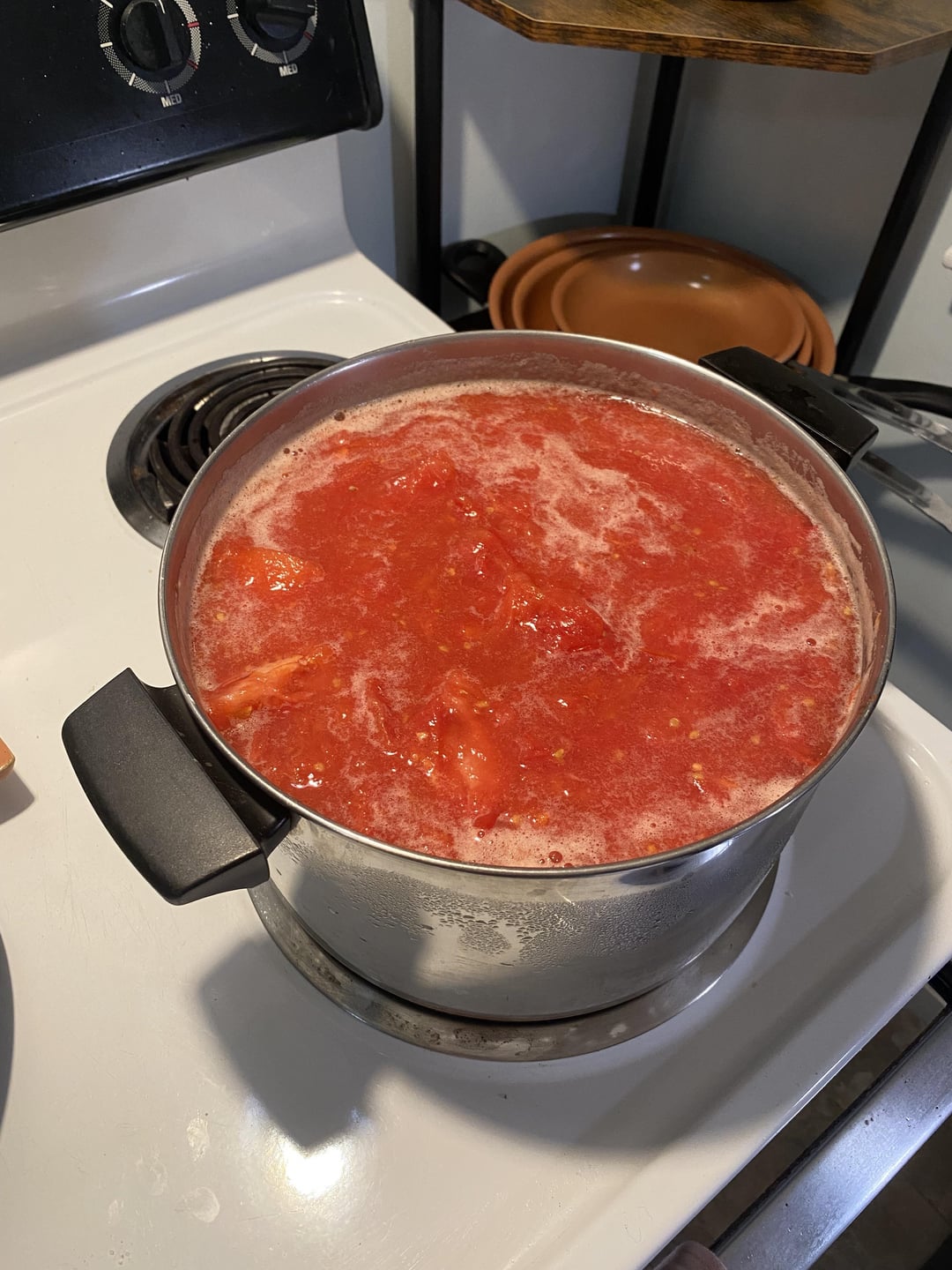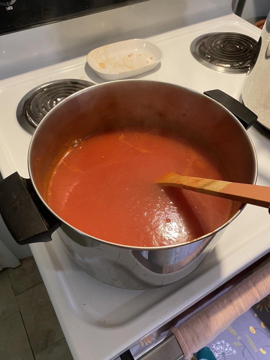 I grew a bunch of tomatoes in my garden this year. I’ve been freezing them until I had enough for a large batch of sauce. I followed Balls recipe and cooked the tomatoes down, ran it through a food mill and cooked them down again. Added just salt and lemon juice to the jars before water bathing for 35mins. I only had one lid failure, but it was an older lid, so I’m not surprised. I think I’ll make myself some soup with that one tonight (yes, it’s in the fridge now!).