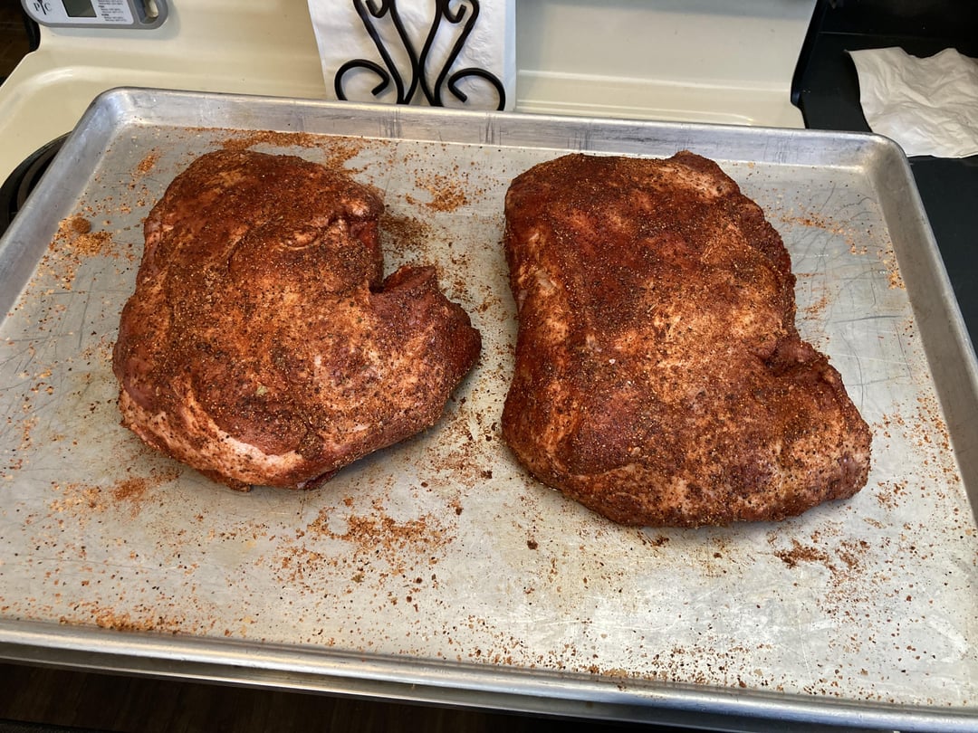 Used Traeger Pork and Poultry seasoning as well as Tig’s Pork seasoning mix. Traeger Pro 34.