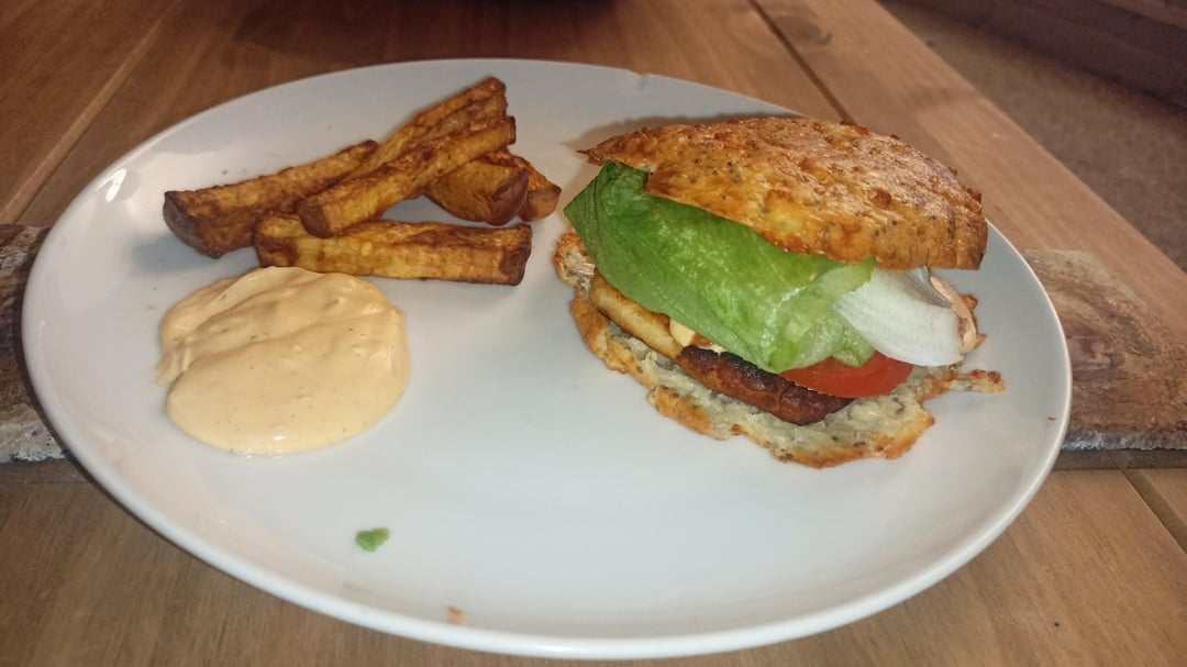 2nd picture: Halloumi burger with cheesy psyllium husk baps and swede chips = 18gs carbs