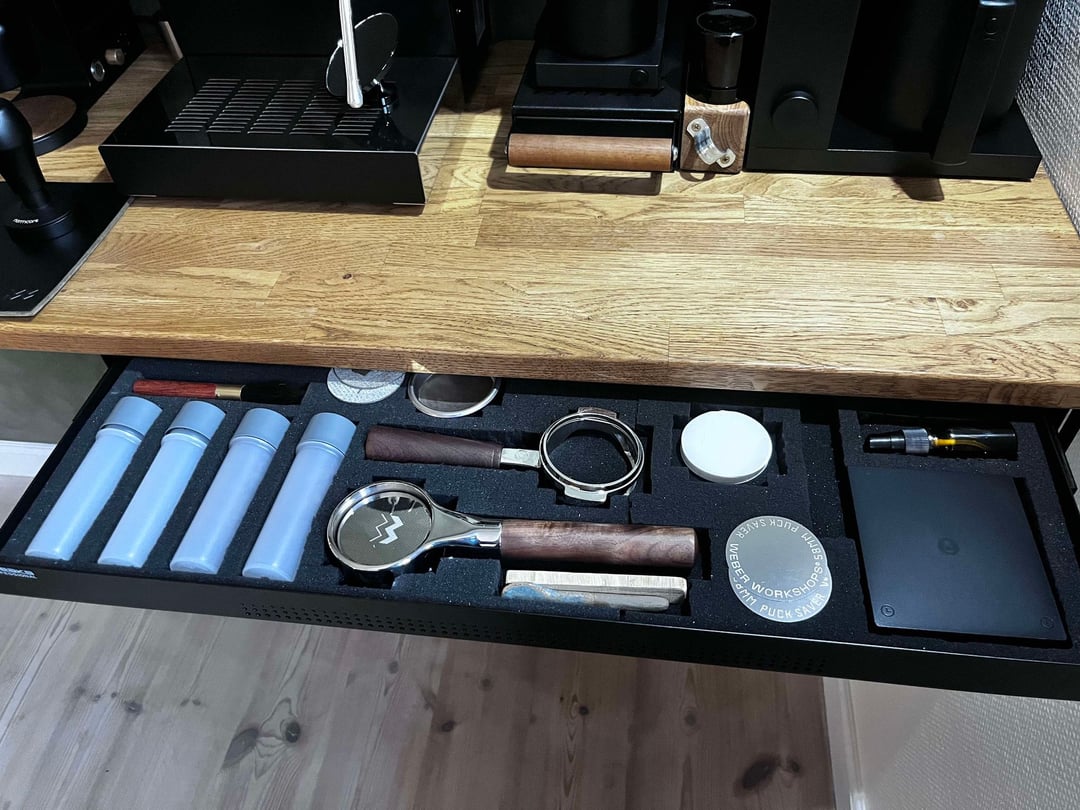 However, becoming a dad meant that a relocation of the coffee station was necessary. This has resulted in a more convenient location, however with significantly less space. Made space for the essentials with a shallow drawer under the table.