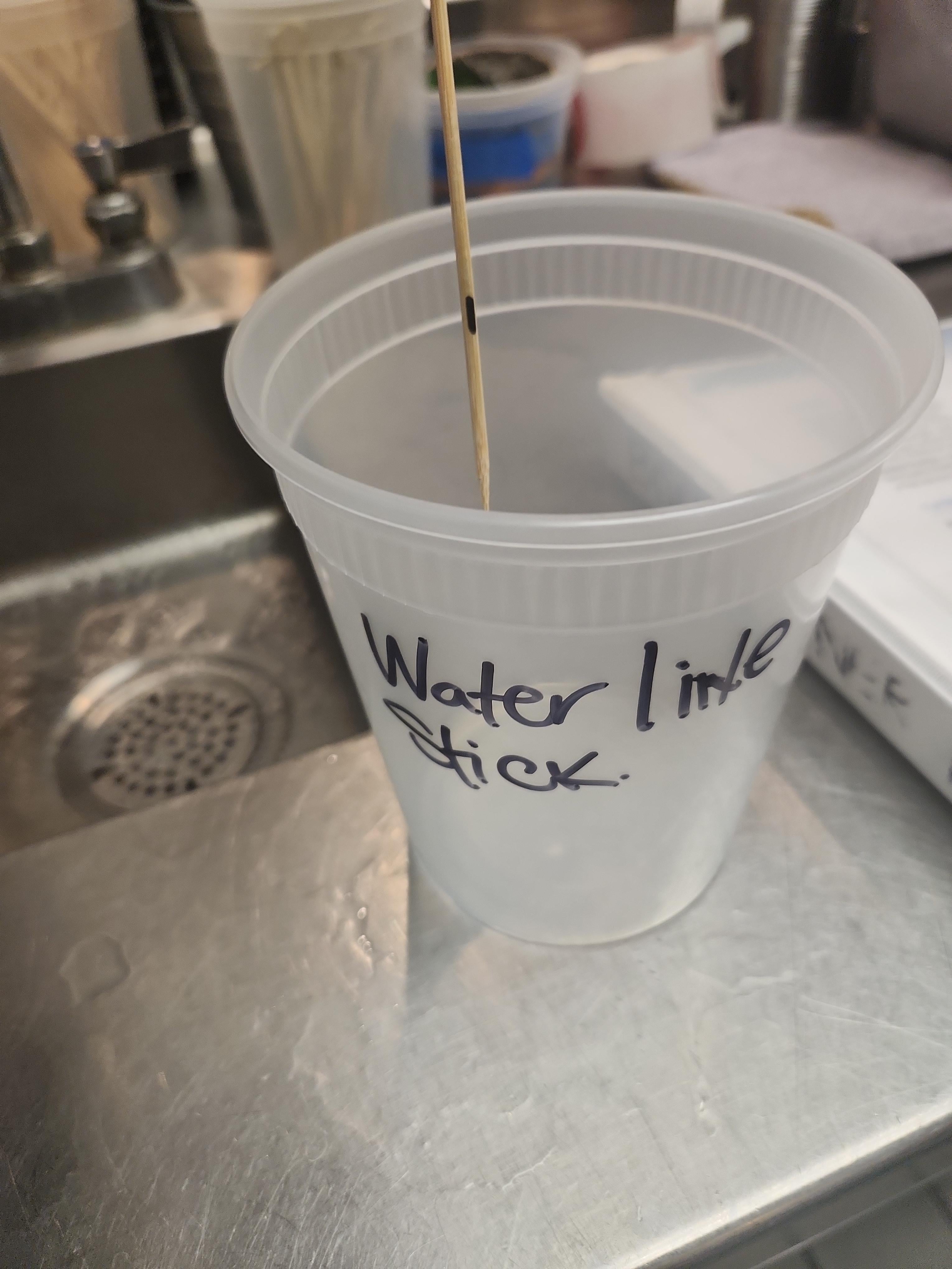 My boss "chef in title only" said we're spoused to put the bamboo skewer into a pot and fill it to the line as a measurement to make our oatmeal. I've also got a rope with knots tied in it to measure speed.