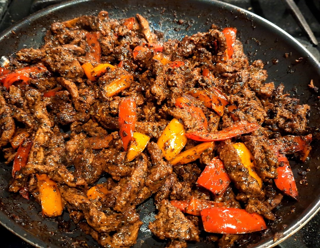 Meat and bell peppers were cooked in a frying pan with vegetable oil and deglazed with beef broth. Came out super tasty.