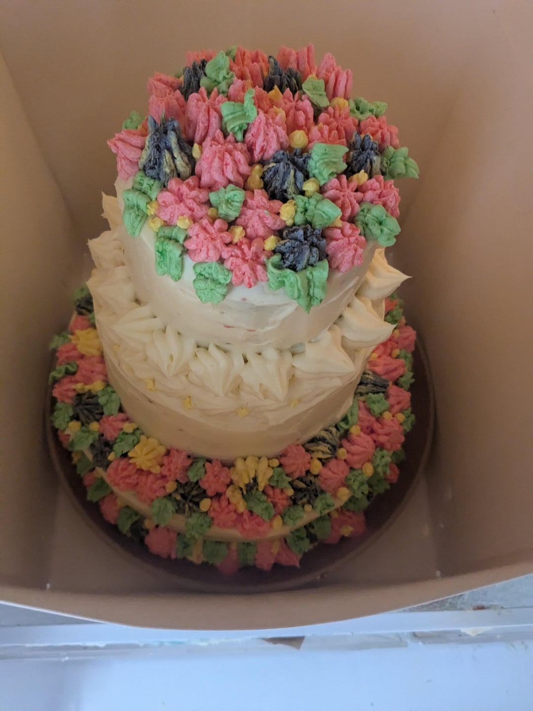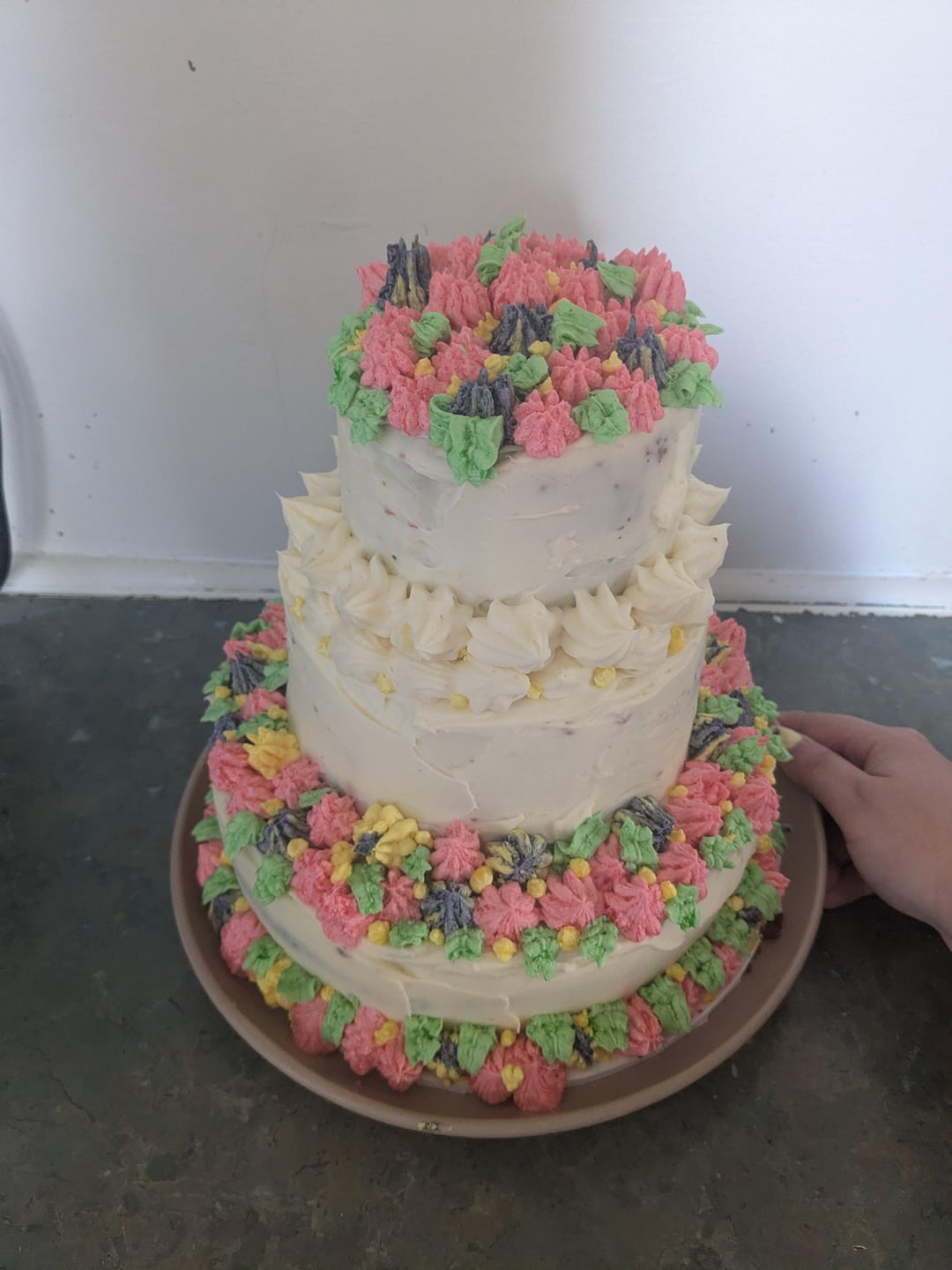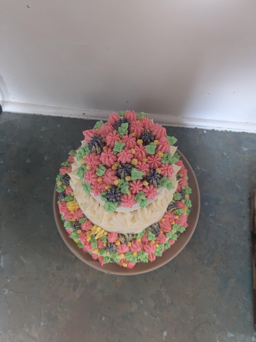Really great for your first cake. On a side note I like how the flowers look like cheerios. 🤣