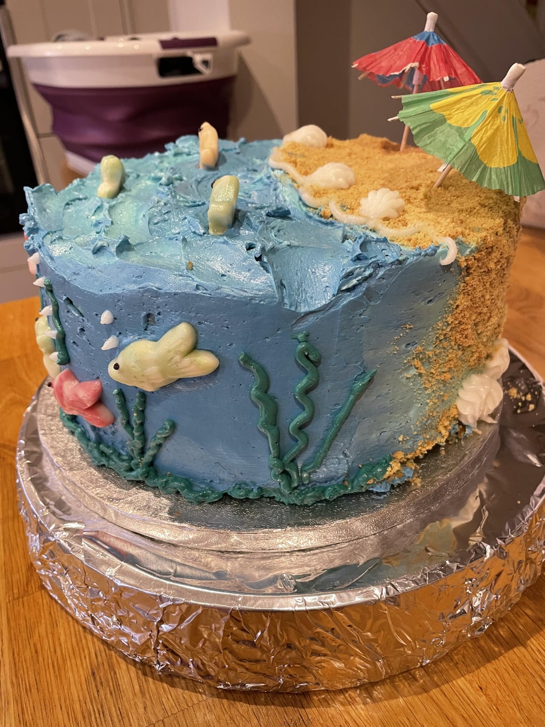 Great work, in particular the ‘waves’ on top of the cake and the beach are very realistic. Bet it was yummy too. What a joyful treat for the wee lad. Well done.