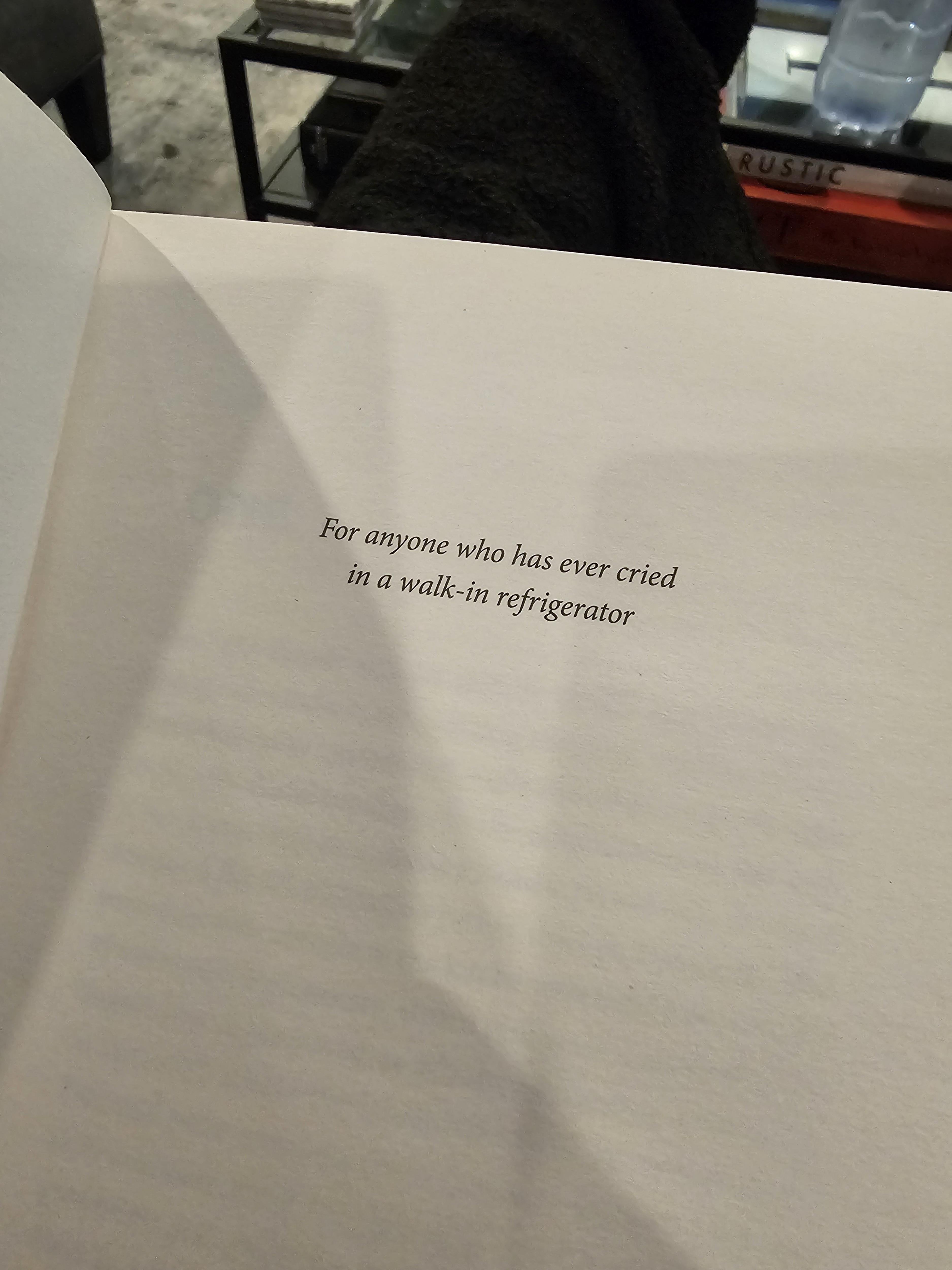 The dedication on my new book…by awolfnamedlynx 18 Comments GSturges 11 months ago “All sorrows are less with bread….” iamnotbetterthanyou 11 months ago I feel seen. Shanoff907 11 months ago You haven’t worked hard enough if you haven’t done it once. Veganberger 11 months ago What’s the book called? SocialistGurkan 11 months ago Is that bored gay werewolf? I’m looking forward to reading that! fumphdik 11 months ago Makes sense. I usually run into someone crying in the dry storage once a week. But same difference. DGriff421 11 months ago I only pounded beers and did bumps in mine Wide_Breadfruit_2217 11 months ago Yep. Went in fridge and apply cold water bottles to eye sockets. Heads tears right off the tracks lightllk 11 months ago I got sexually harassed a couple times in the walk in as well , a lot of stuff goes down in there FangsBloodiedRose 11 months ago Oh my goodness!!So resonate. okmijnmko 11 months ago hmu if you want my recipe to turn your walk-in tears into some high quality fridge steam entirelyrisky 11 months ago LMFAO…that’s sooo many of us… Hour-Requirement6489 11 months ago # I feel Seent (mispelled on purpose :P) 🥹🥹🥹 klgall1 11 months ago I prefer the walk-in freezer. Less likely to get walked in on, and the extra cold helps hide any redness in the face/eyes. HeraldOfTheLame 11 months ago I don’t work in the food industry anymore, only did it part time as a teen and a bit in university but yes this is true Wire_Hall_Medic 11 months ago My neighbor has a bumper sticker that says, “go cry in the walk-in.” HolyDarkDeath 11 months ago I prefer crying and screaming at the same time. EXScarecroW 11 months ago Oh I’ve cried on the line, I don’t care. First Mother’s Day was a bitch / 16 yr. old me was soft. We did nearly 35K.Looking back 15 years now I feel nothing can phase me. It only gets easier.Write A CommentYou must be logged in to post a comment.
