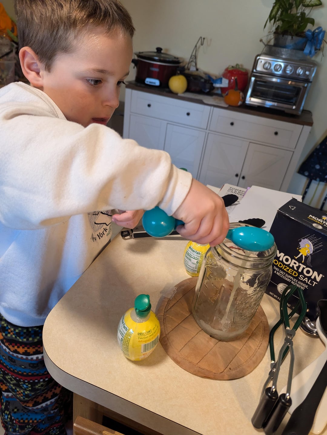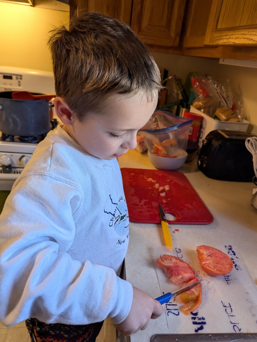 My mom taught me how to water bath can my garden tomatoes last year, and we did it together then. Today I tried it for the first time by myself, my 6 year old helped cut the tomatoes and add the lemon juice. He said canning was so fun! (He wasn't the one to clean up after 😅). I froze the tomatoes as they ripened all summer. So grateful they all sealed!