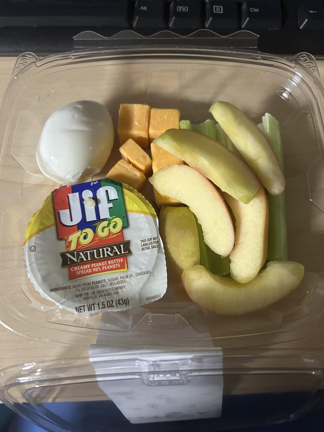 This is a “protein box” that has 1 egg, 6 apple slices, 4 celery slices, 6 cubes of cheese, and a 1.5 oz cup of peanut butter. by cinammonrollerton 3 Comments unsweetenedpureleaf 1 year ago This is the one time i might say the label is wrong… fabgirly 1 year ago * Peanut butter-250 calories * Boiled egg – 72 calories * cheese cubes – 183 calories * apples and celery – 80 caloriesTotal: 585 calories.In other words, 600 calories max. Engineer-Sufficient 1 year ago 70 for the egg, 45/50 for the apple, 250 for the cheddar cheese, negligible cals for the celery, and 250 for the pb.Write A CommentYou must be logged in to post a comment.