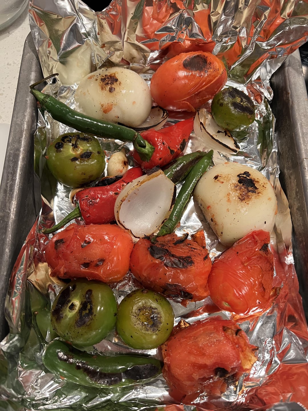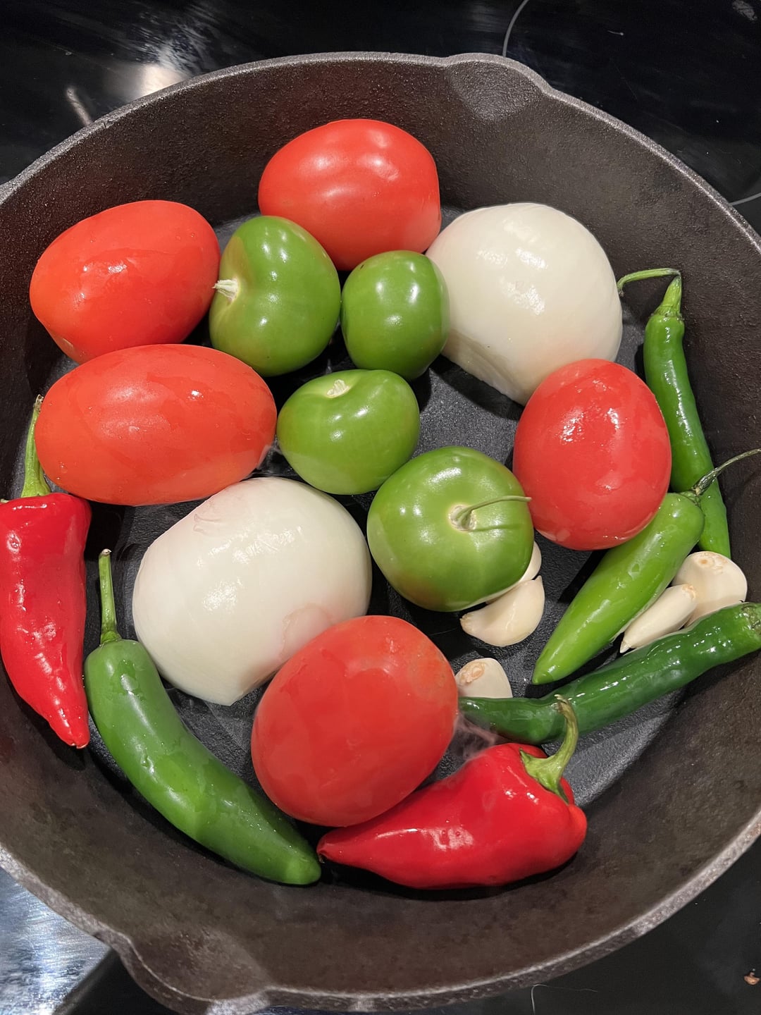 •5 Roma tomatoes •4 tomatillos •3 red peppers (honestly just grabbed them not sure exactly what they are) •4 jalapeños • 5 garlic cloves •1 white onion