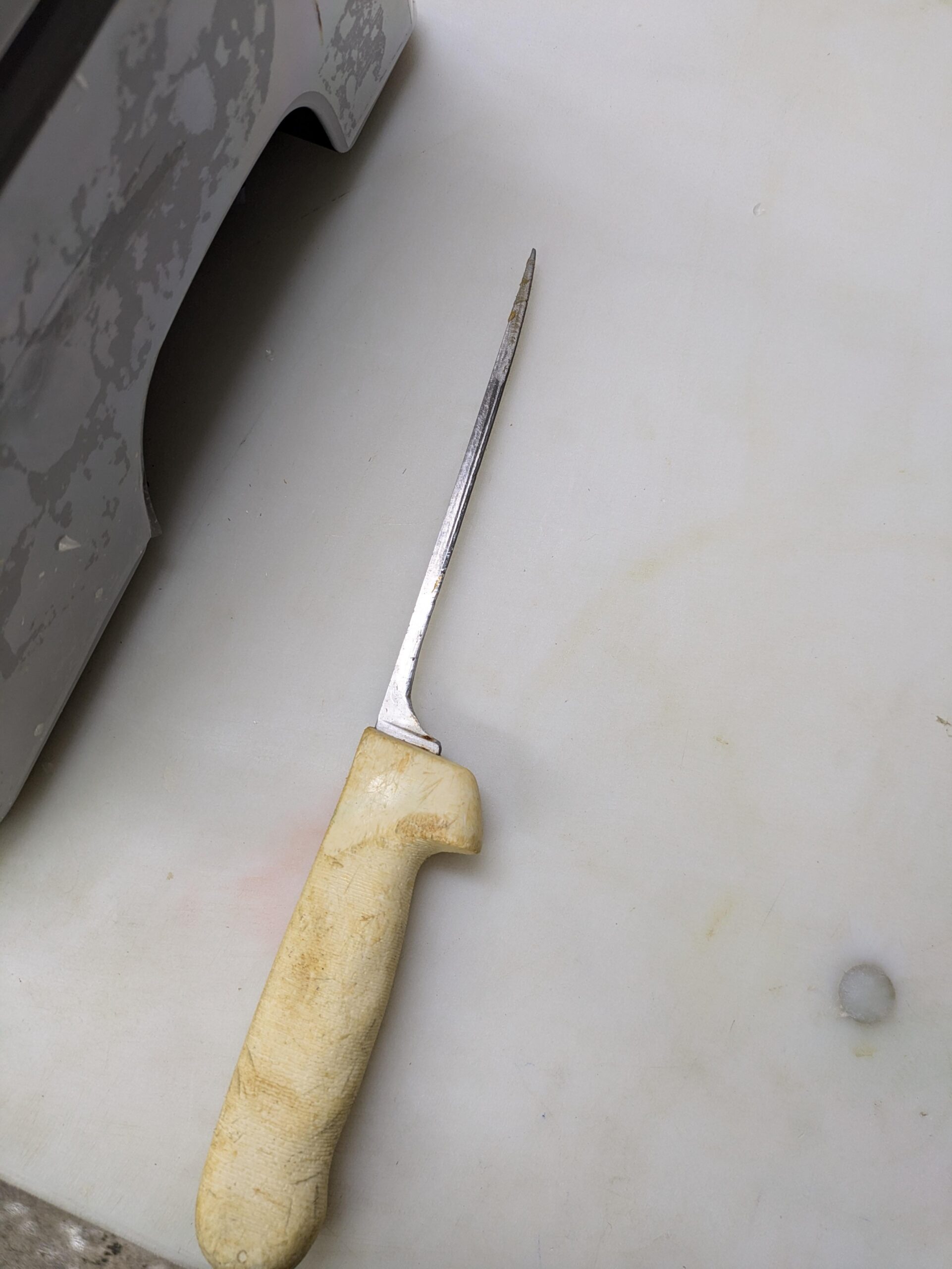 This is a real knife that is used by the fish cutter at my current job. He’s been using it for 35 years.