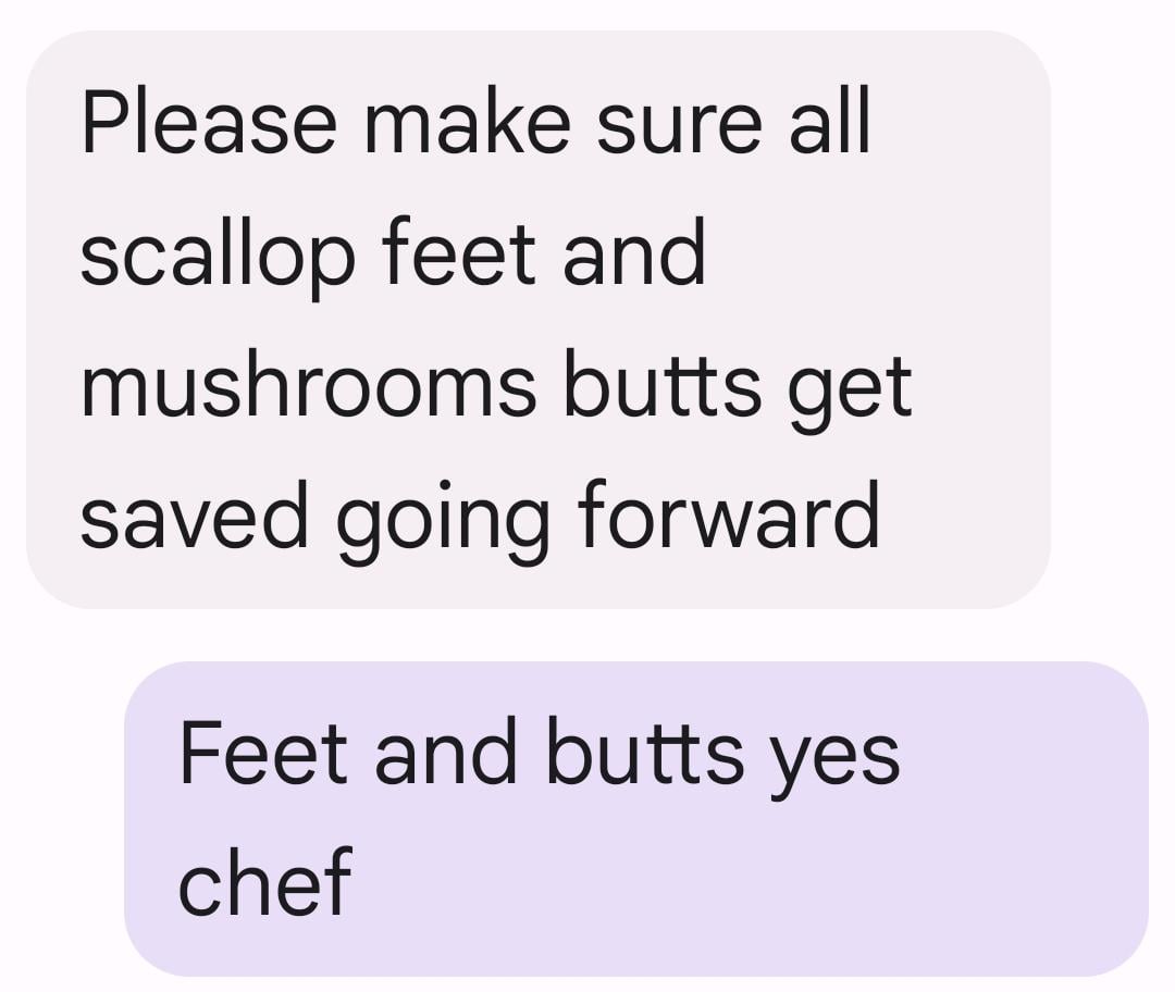 To be clear, this wasn’t like a “hey fucking do this thing cause it’s been a problem we havnt” but rather ” we are gonna start making mushroom jus and scallop foam for the new menu”