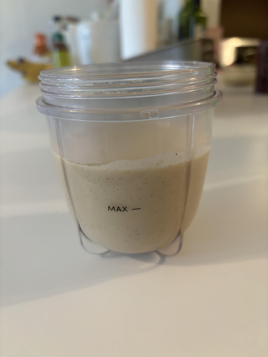 Blended in the vitamix for a couple of minutes. It’s on the thicker side so adjust water to your desired consistency. If you want it sweeter, add a bit of sugar.