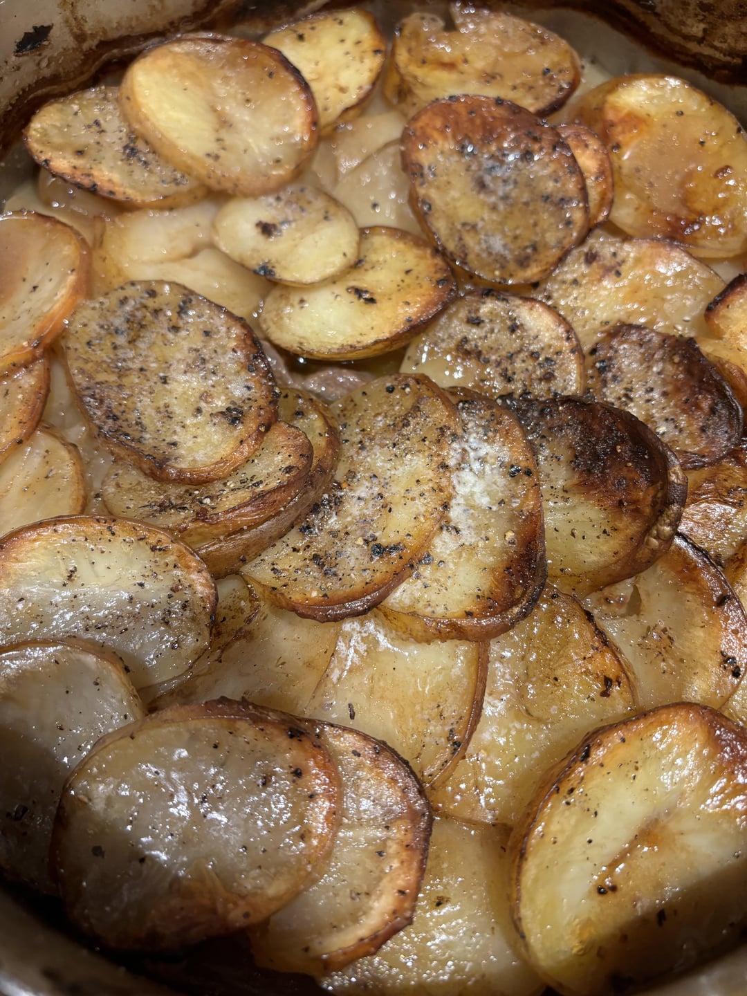 Lamb rump steaks, onions, carrots, stock, thyme, Worcester sauce, plenty salt and pepper. In a pot, covered with sliced potatoes and butter (more salt and pepper). In an oven at 160c for 2 and a half hours (lid on for first hour).
