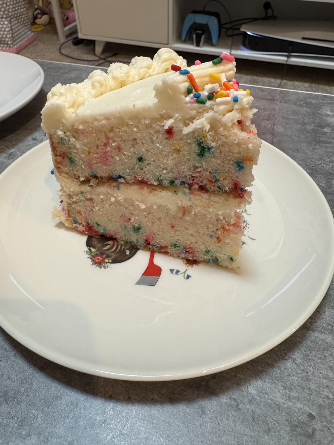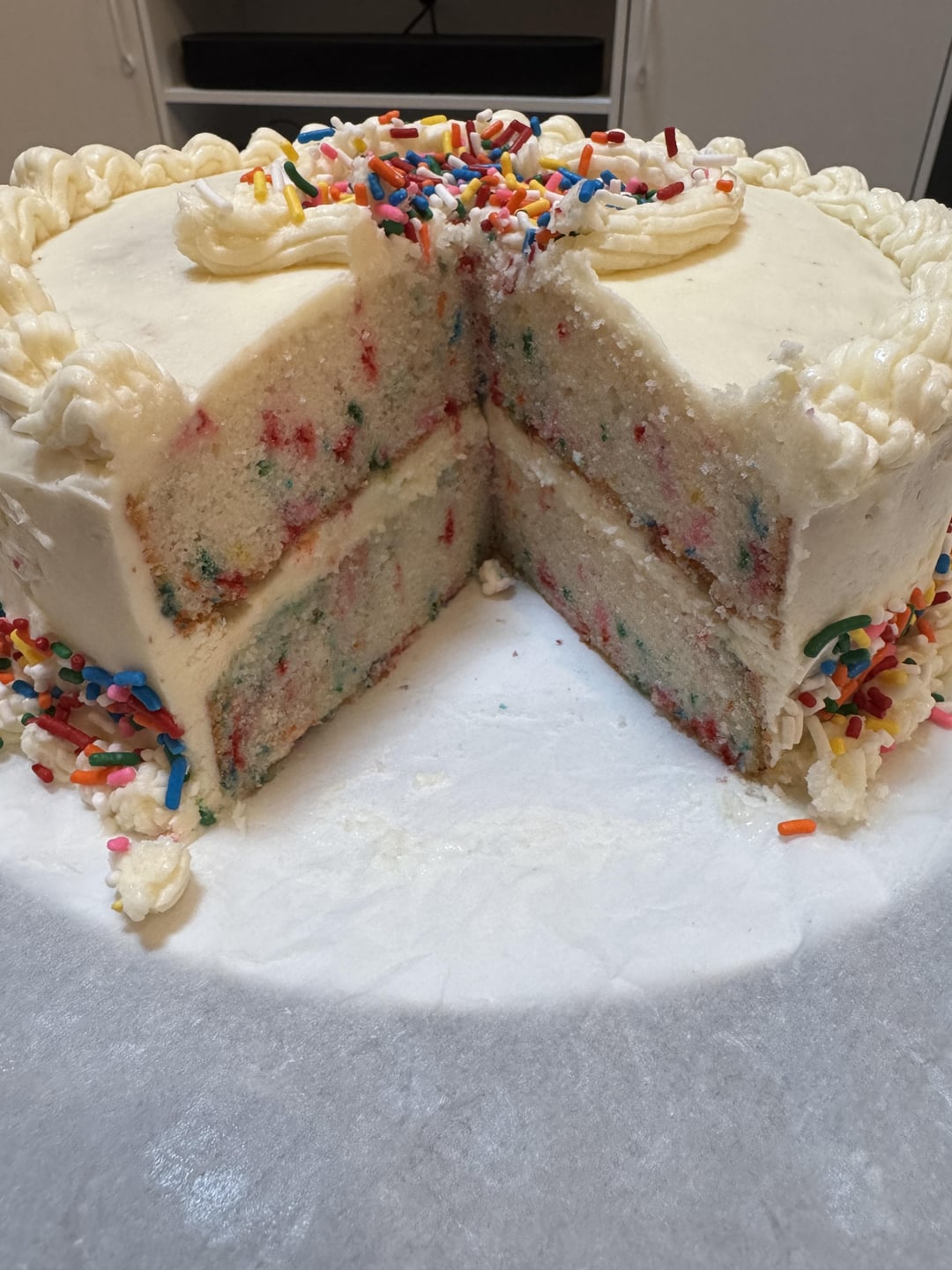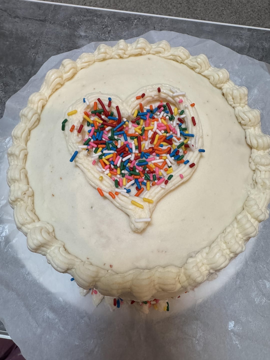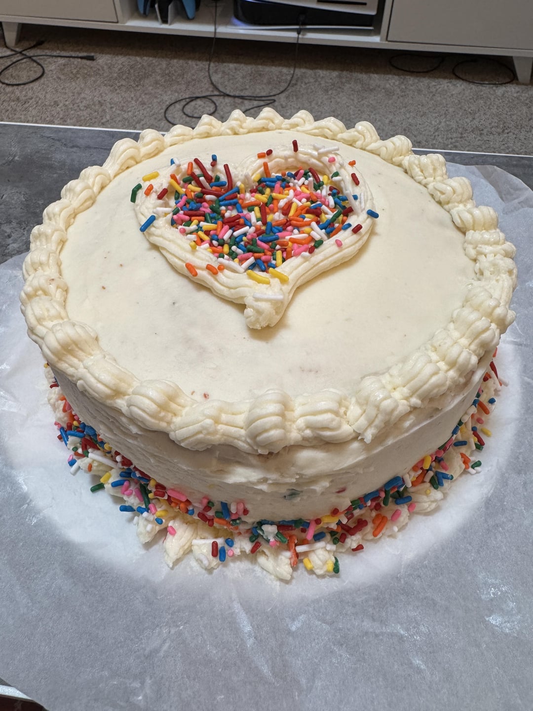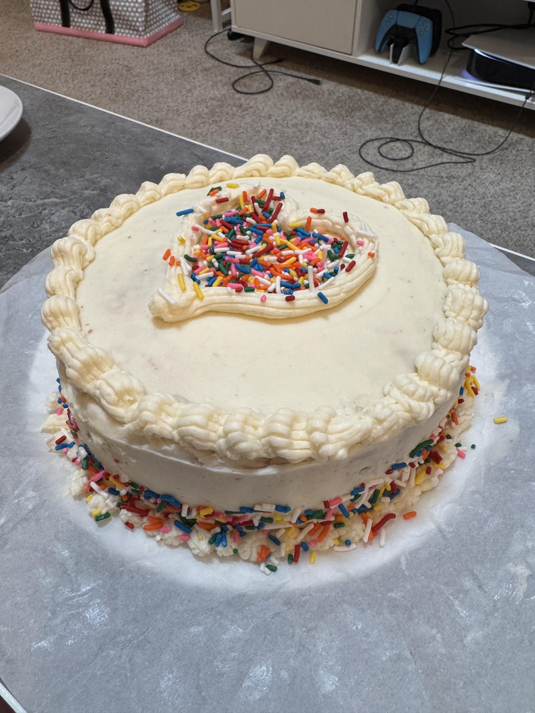 What a wonderful first cake! Two layers, piping, and sprinkles. Nice!