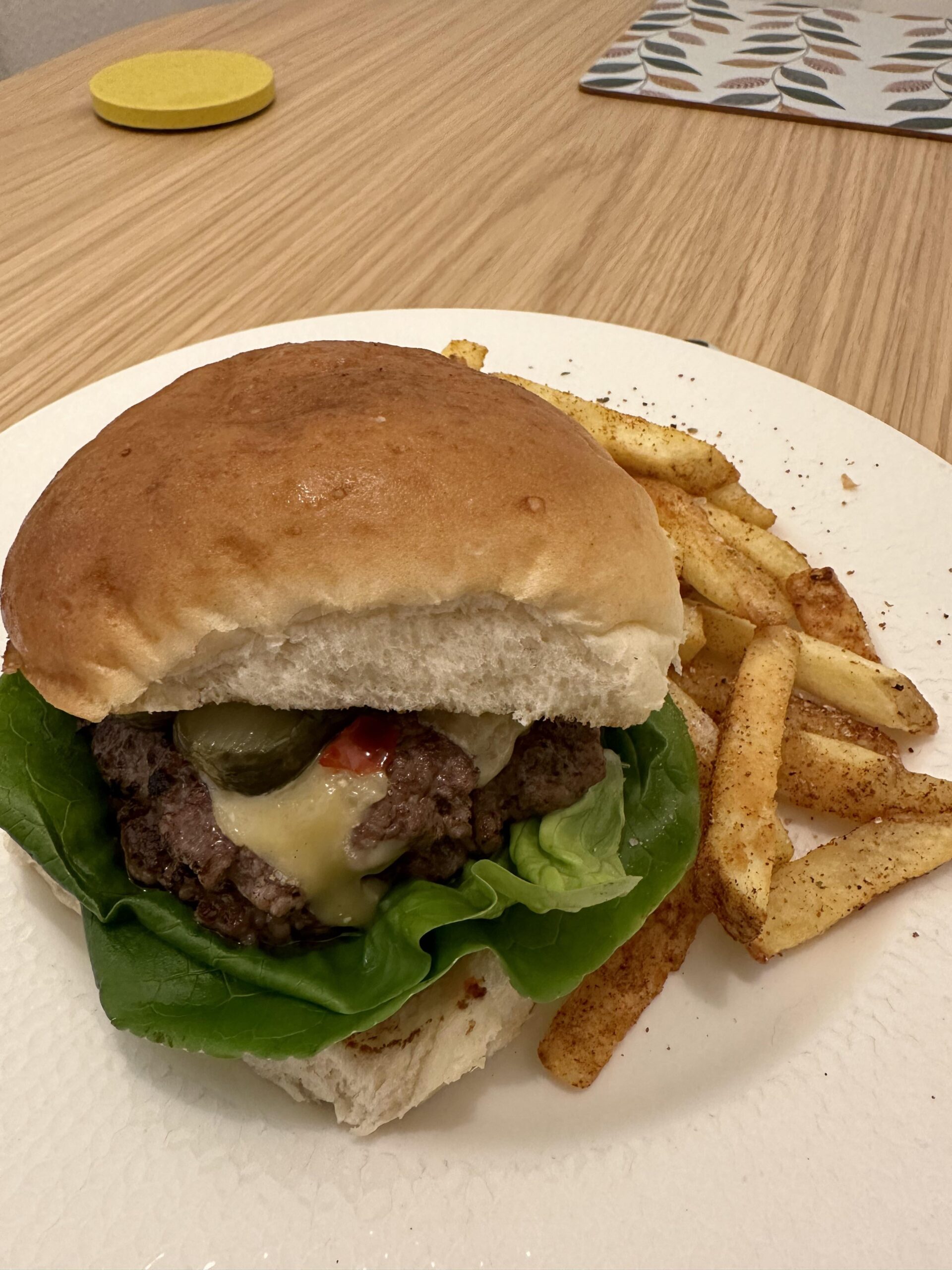 Double smash burger, with Gouda, chilli jam, lettuce and pickle on milk bun. Cajun fries on the side