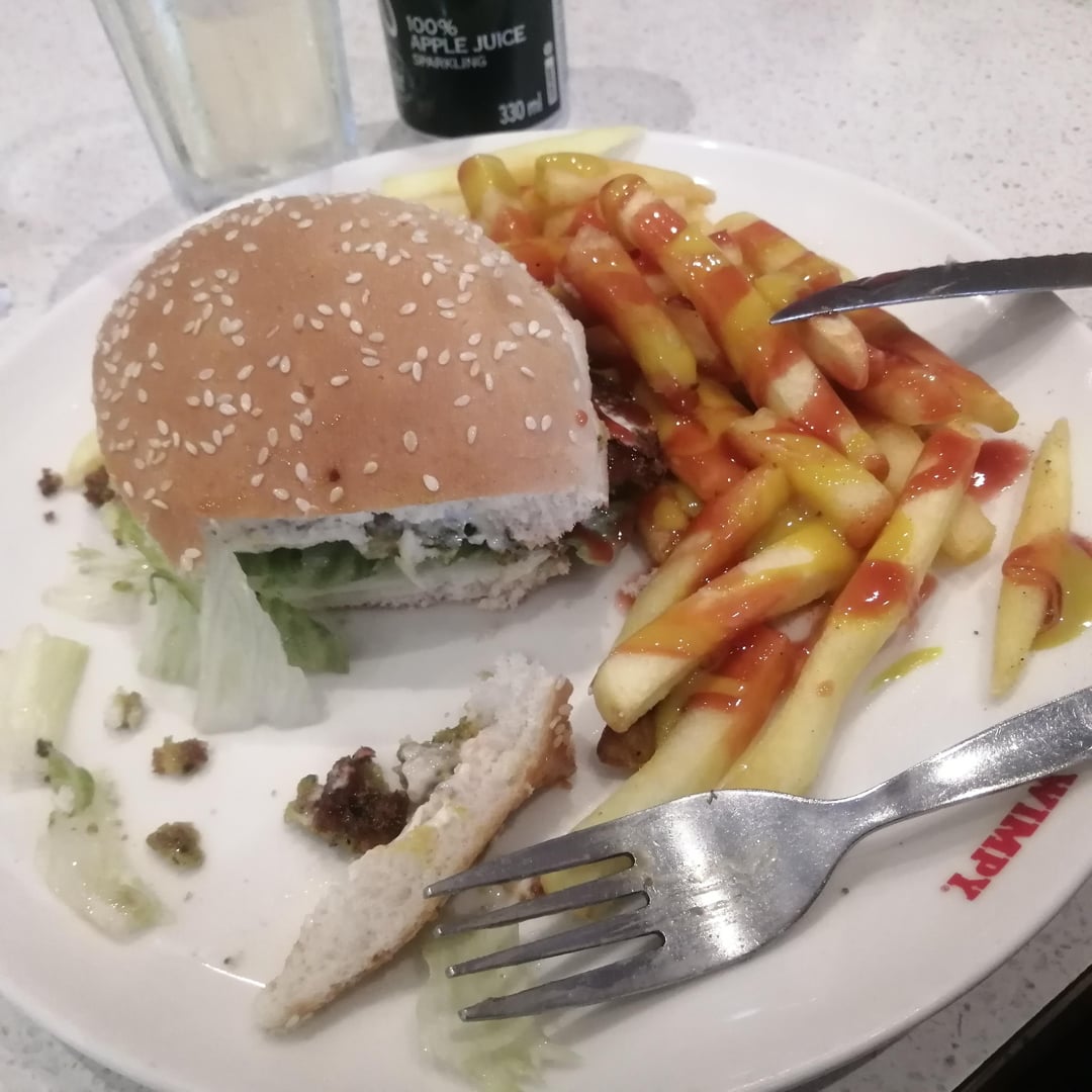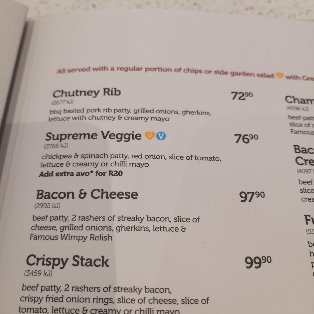 Then I ordered a Supreme Veggie Burger at a place called Wimpy. It gave the amount of kJs (2785kJ) but I don't know if that includes the chips/fries or not. Any ideas? The picture included is the meal and menu for Wimpy.