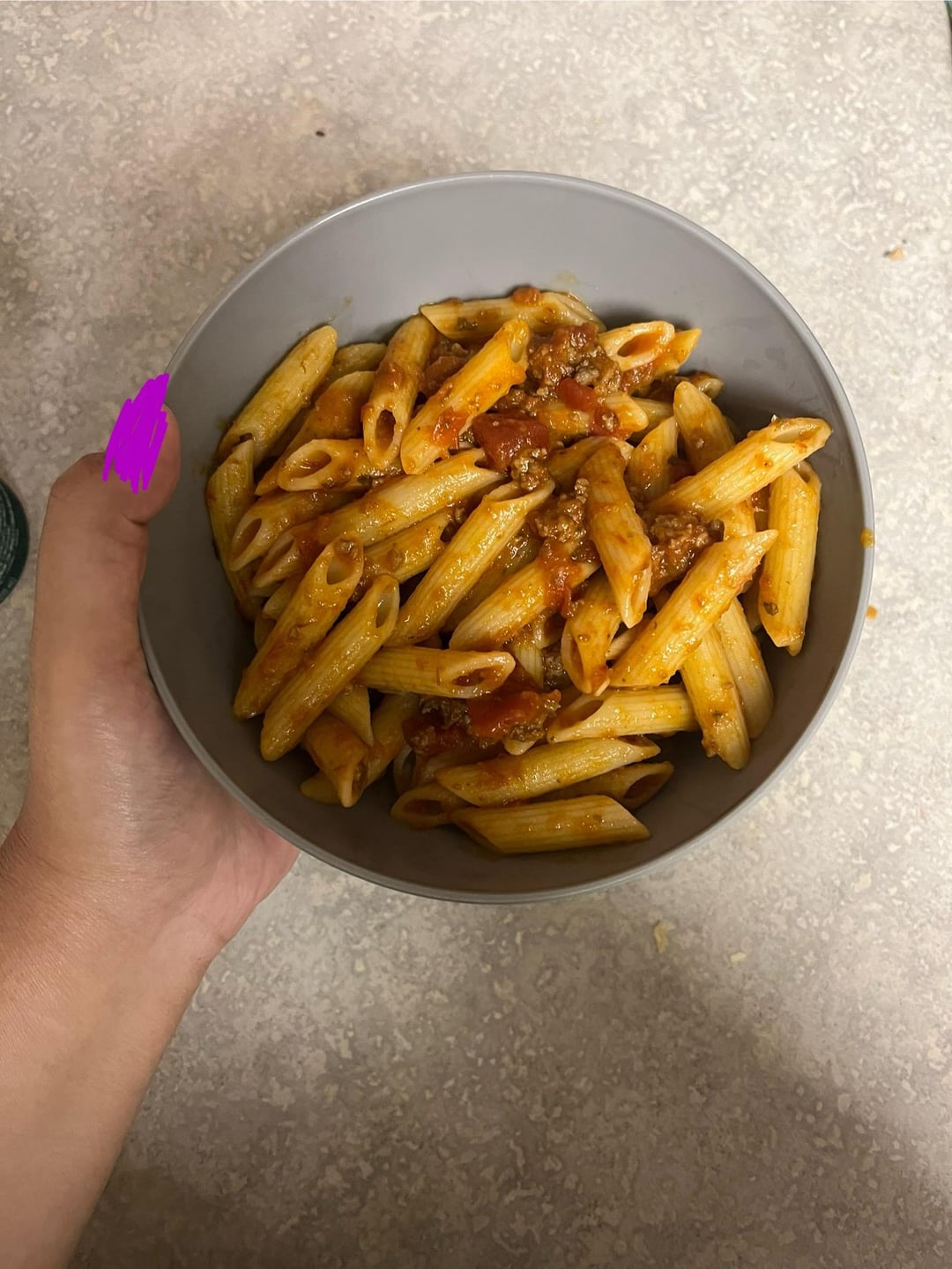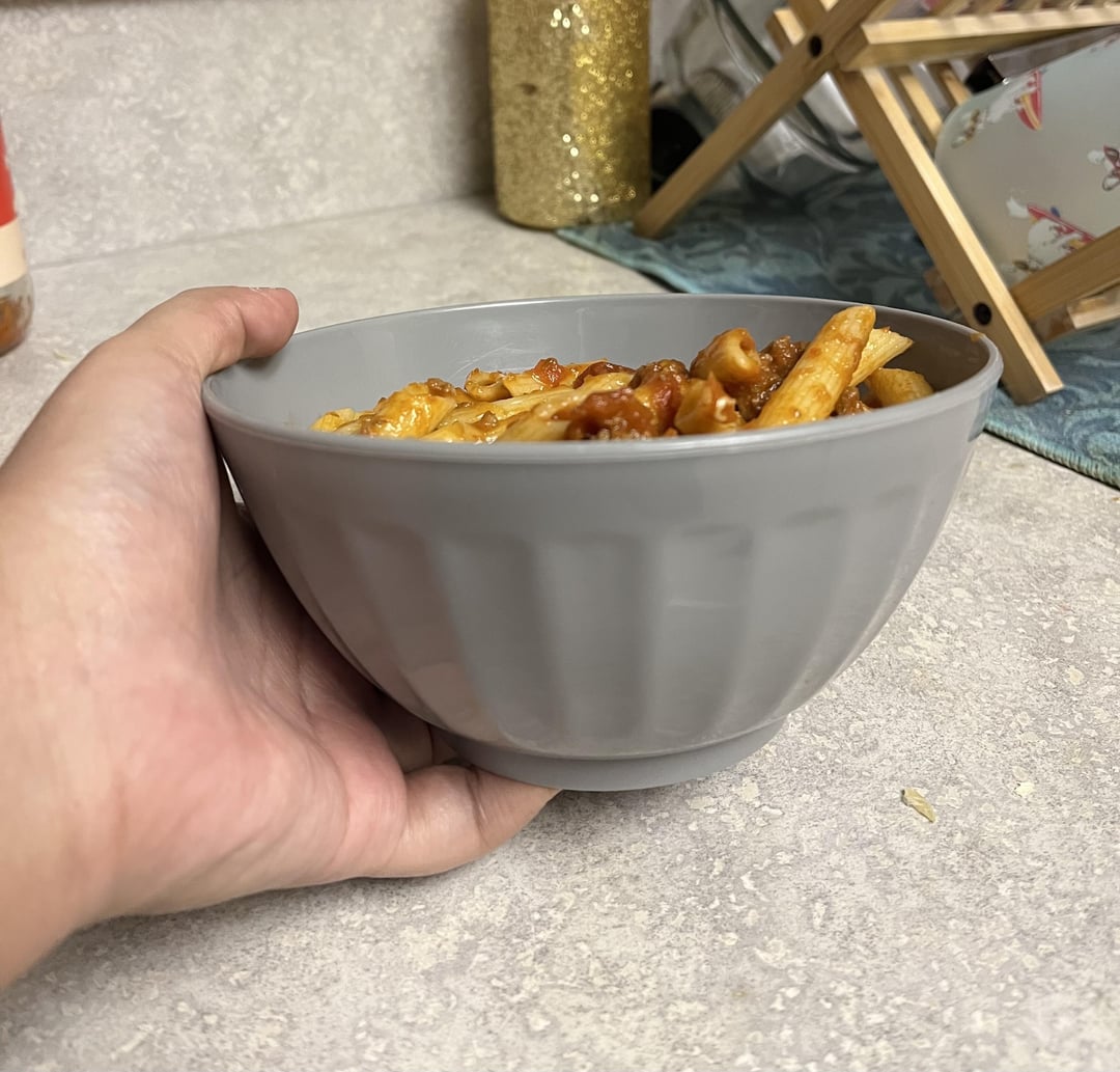 It’s penne pasta, marinara pasta sauce, and ground beef. the sauce is pretty light because i didn’t have enough lol. My goal is to stay under 1000 so would you say it is? First pic looks like i dont have a lot, but second pic you can see i filled it almost to the rim😅
