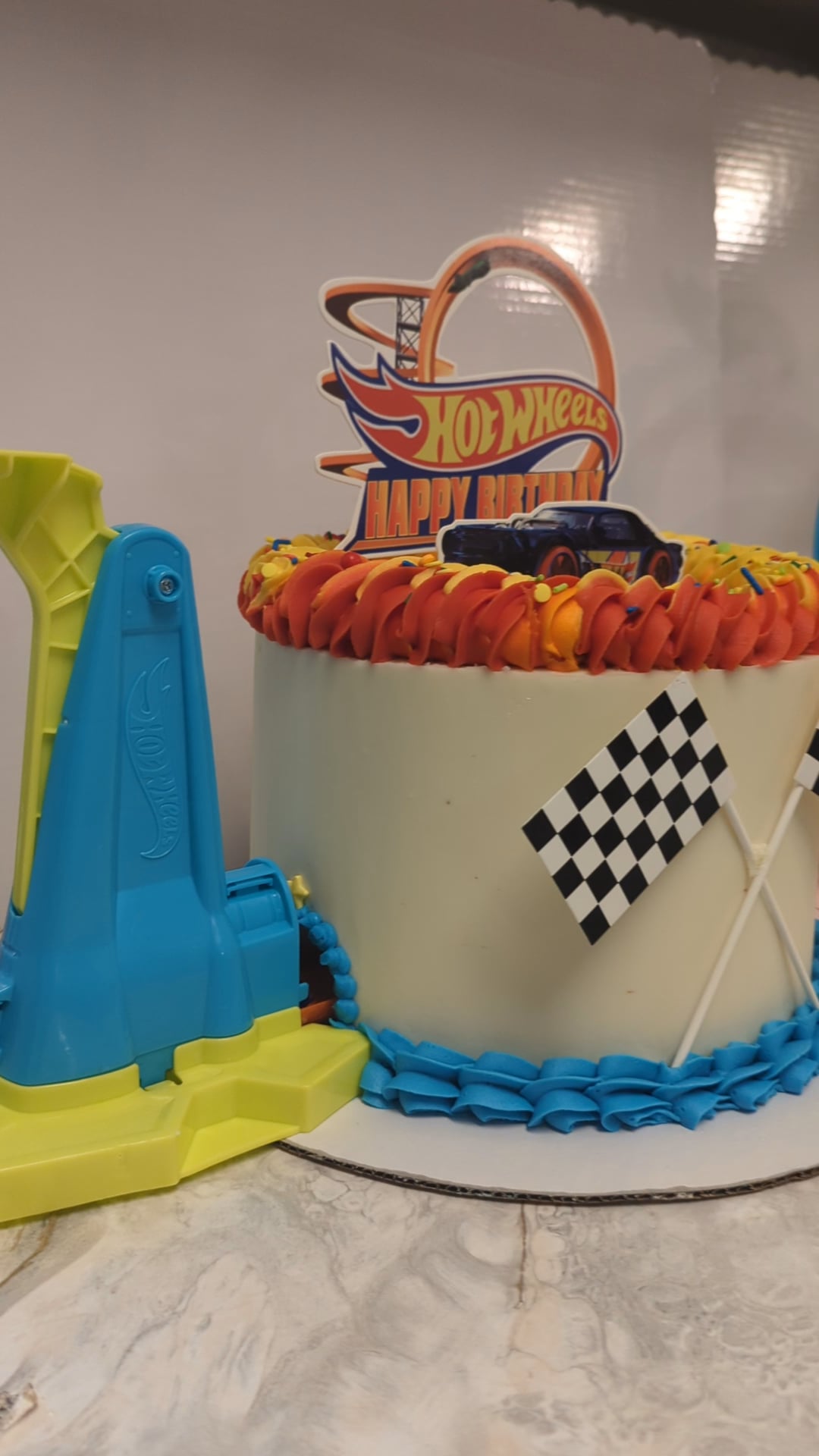 My 4 year old son asked for a Hot Wheels cake with a car going through it…