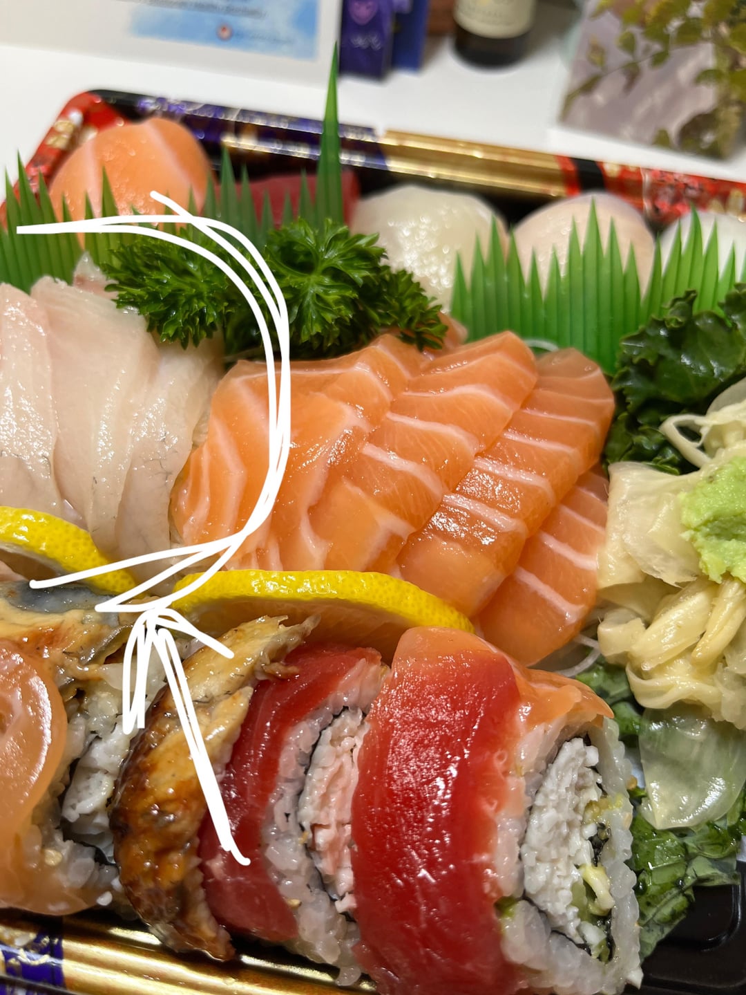 hello guys, a few hours ago i bought a sushi combo from my local hmart, and i was just wondering if this sashimi right here (that i circled) looks like escolar? i’ve had escolar before and this sashimi right here tastes highly identical to escolar, but it’s not white like escolar and it has a slight pink tint to it, and the pattern also doesn’t really resemble escolar too.