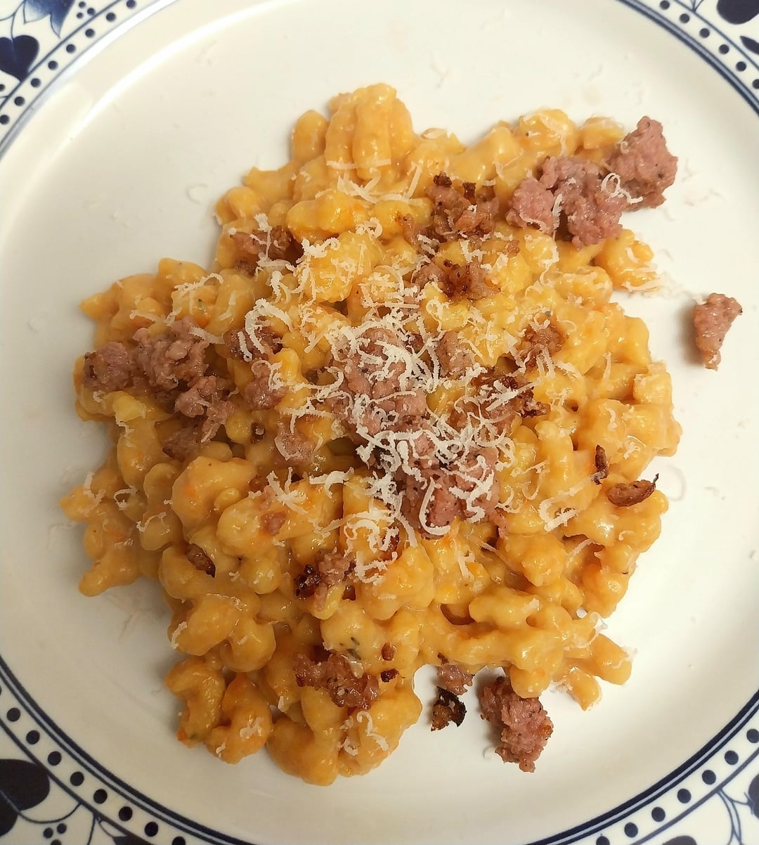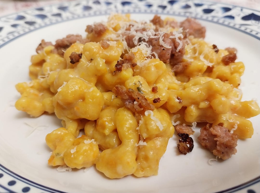 Cook the pumpkin in the oven, then let it cool, blend it, and add the flour, egg and thyme. Add the salt to boiling water and drop the spätzle using a spätzlehober (or also a potato masher if you can’t find it) cook until they float and drain into a bowl with some butter. Add the sausage, parmesan and enjoy!