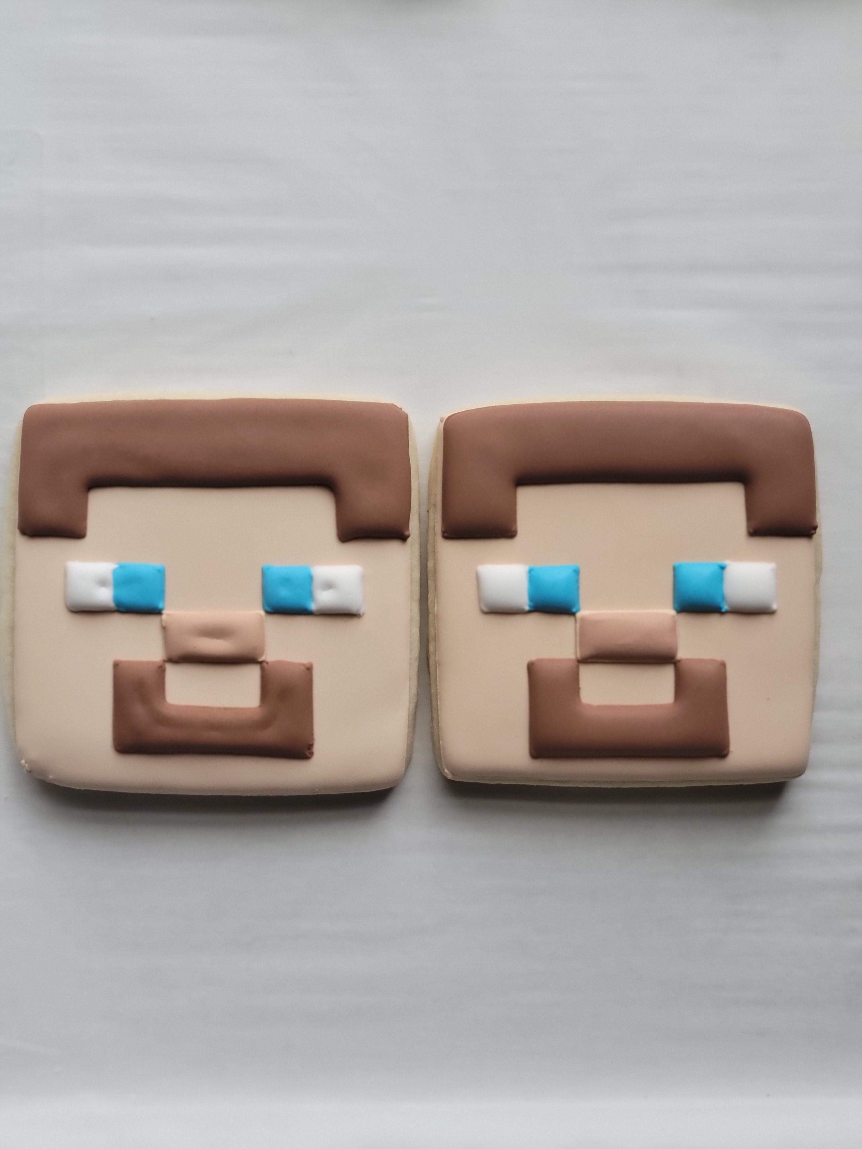 I had an extra cutout while decorating this Minecraft order, and thought it would be cool to do a little test and post the side-by-side comparison. Both of these cookies were decorated using the same icing, and the exact same techniques to avoid cratering (poking holds and piping squiggly lines before flooding). The only difference is that for the cookie on the left, I let the base flood dry overnight before adding the face details. For the cookie on the right, I waited 30 minutes after flooding before adding the face. The results speak for themselves!