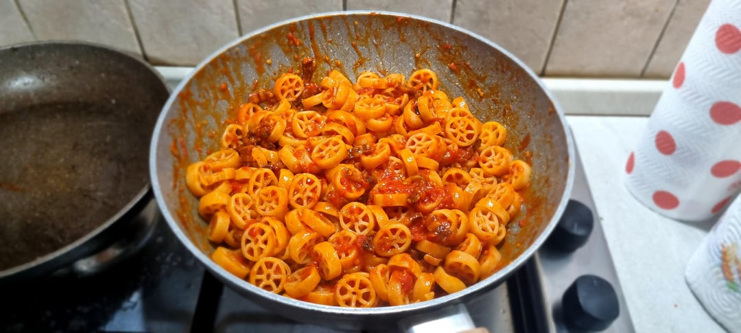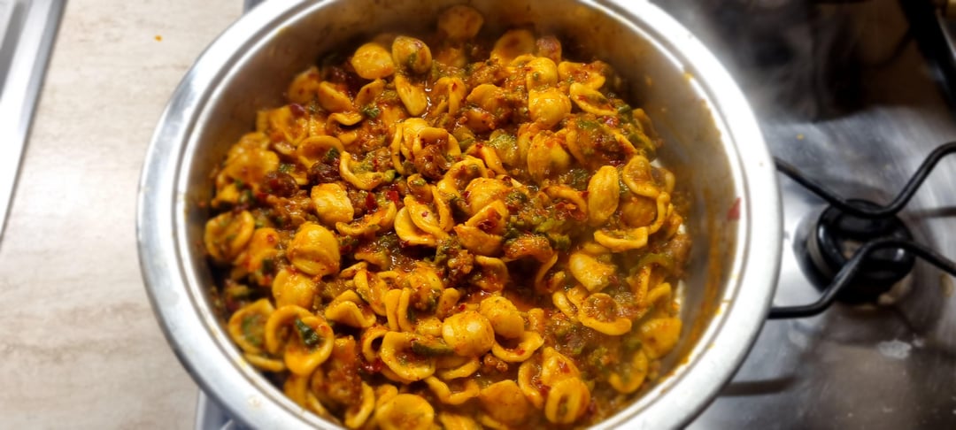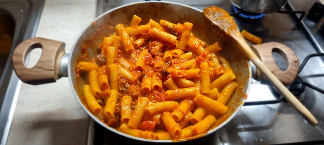 Linguine with shrimps and cherry tomatoes, Tortiglioni with white ragù, carbonara, orecchiette with zucchinis, nduja and sausage and last but not least two amatricianas with tortiglioni and rotelle