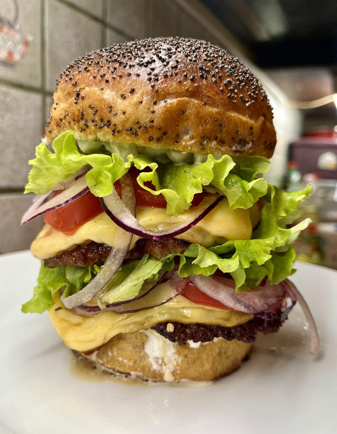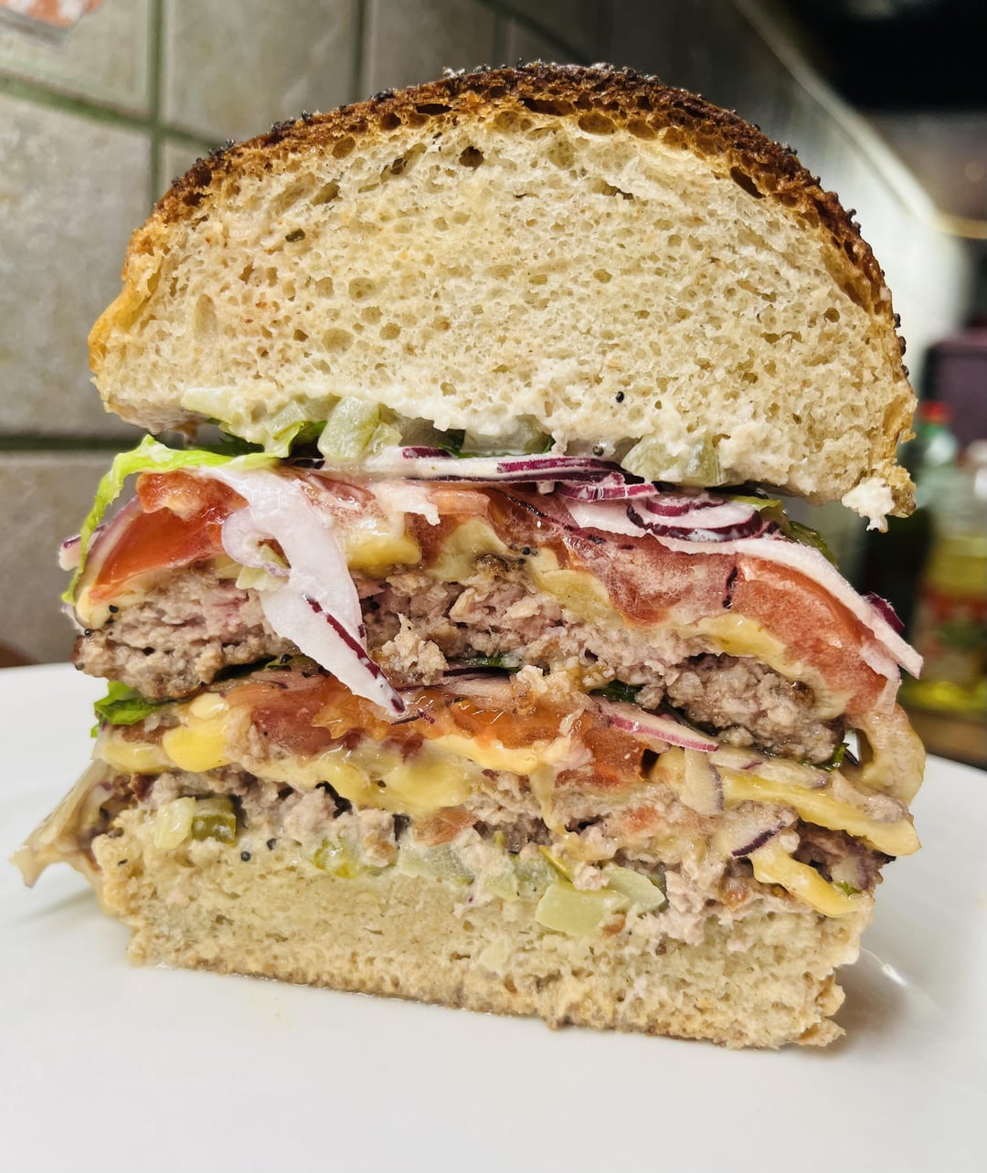 Bottom bun. Chopped pickles with mayonnaise, a nice pan grilled minced beef patty, smoked melting cheese, fresh tomato slices, thin red onion slices, lettuce. Repeated once more. Top bun.