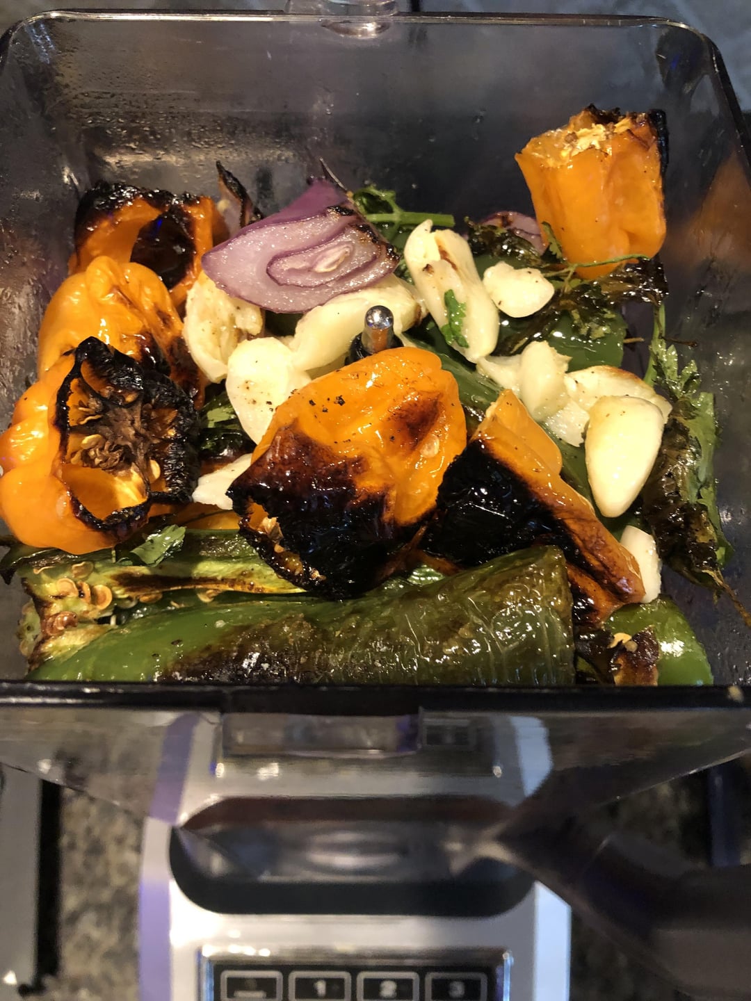 First time making it. It’s honestly easy people. Cut vegetables. Cover in oil, salt, and pepper, broil for 17-20min. 1/2cup water to blender before adding hot veggies. While blending drizzle in up to 1/4cup of olive oil (or your fav oil). This helps thicken the salsa. Hit with lime juice and salt to taste.