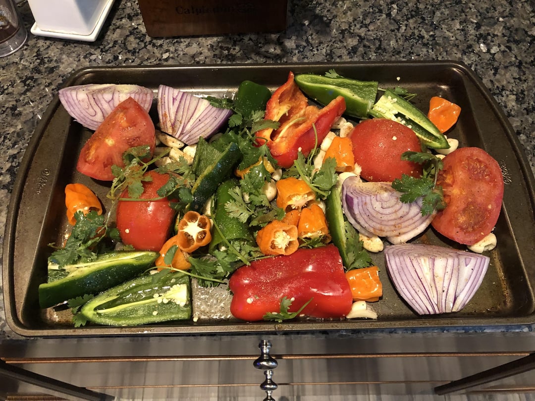 2 poblano, 3 jalapeno, handful of habs, red pepper, red onion, 2 beefsteak tomatoes, bunch of smashed garlic cloves, and cilantro.