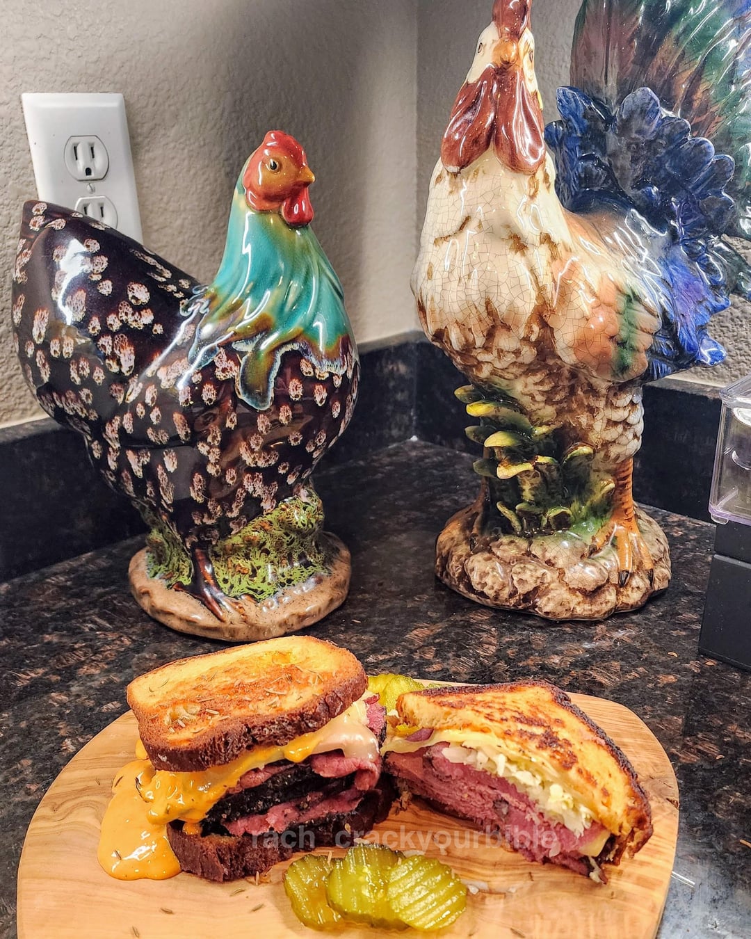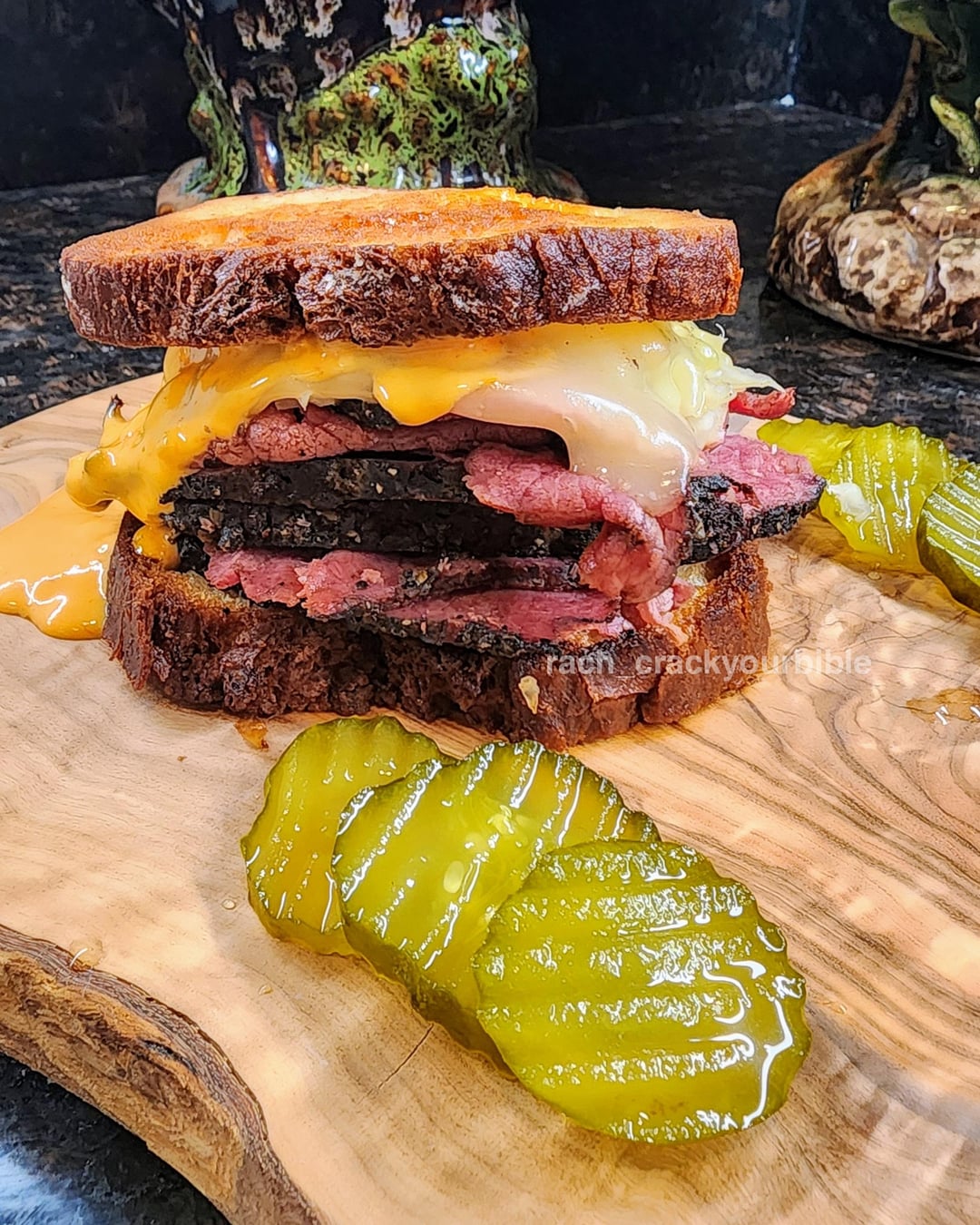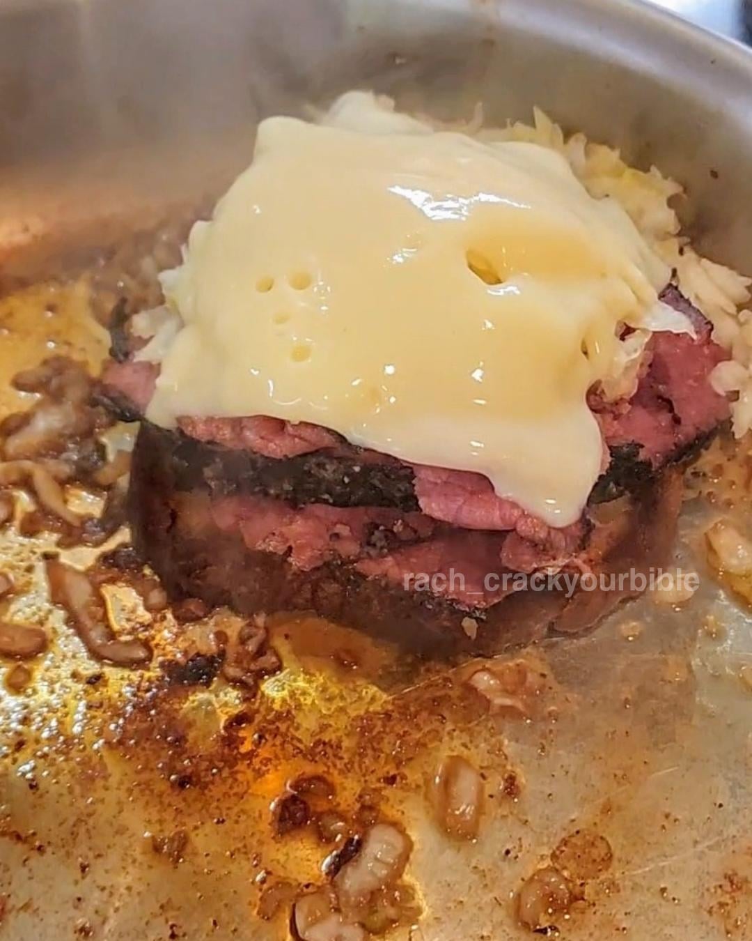 I used a melting dome on the cheese after toasting the bread and heating the pastrami. I threw in an espresso cup of water to steam it.