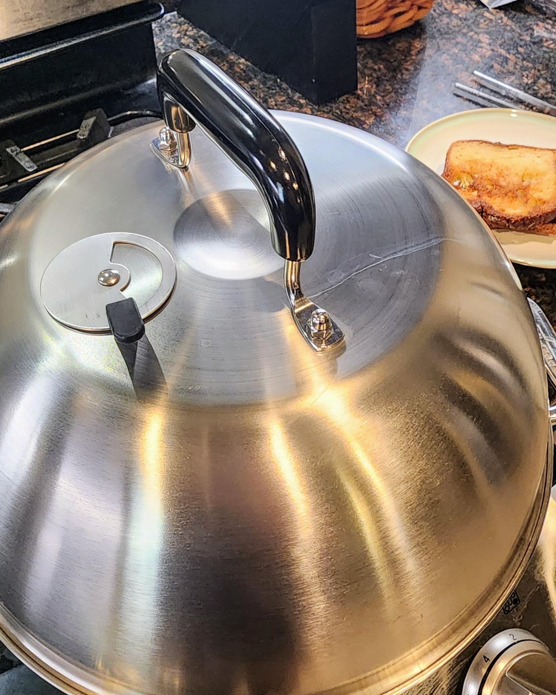 OMG, gorgeous! I love the board you served it on (not to mention the background ceramic chickens). May I ask, what is the dome on the 3rd picture? Is it to grill the bread, but with a steam spout to regulate? I’ve never seen one, and I thought I had everything possible in the kitchen!