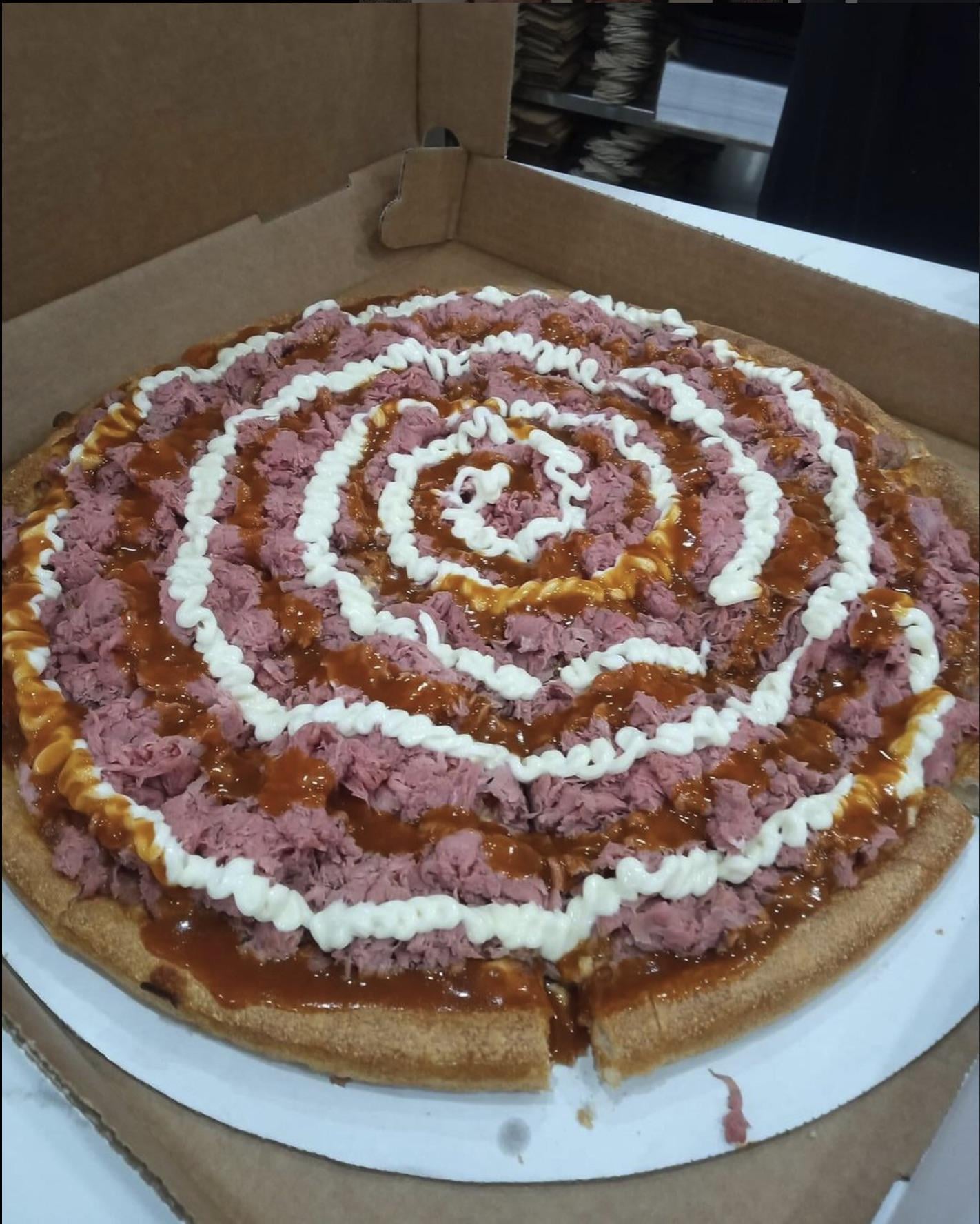 This “pizza” looks like it’s topped with nothing but sliced roast beef, mayonnaise and, what i assume to be some sort ketchup or maybe chilli sauce. But I don’t see anything else on it. Is that right? Is that it?