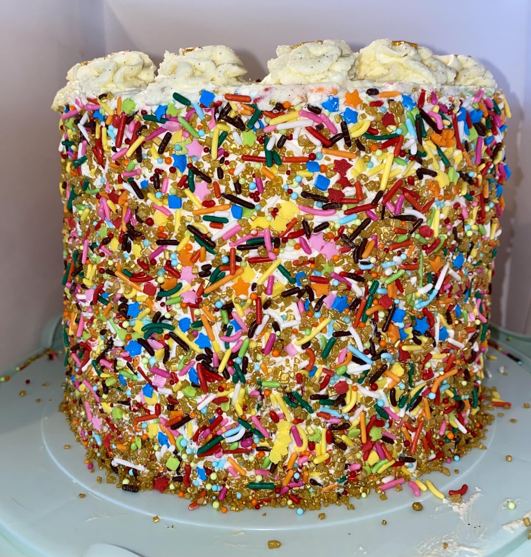 I’m a baker/cake decorator and I think you’ve gotten lots of good insight here, but I’ll still add in my thoughts. Reevaluate your buttercream recipe. I mix my buttercream in my stand mixer for about 25 minutes. It makes a huge difference. Then another 5 on low speed to knock out some bubbles. Clean your cake drum of frosting and loose sprinkles. The sprinkle mix you have isn’t suitable for a full cake cover. Try to pipe any borders with even spacing. You could make them higher, connect it to a rope, or use a different type of star/ flower tip. To give you an idea of pricing, If I made this type of cake, I would sell a 6” cake for $80, with cost going up for any specialty flavors or fillings. You can check my post history to see my level of proficiency. I’m not an expect but would classify myself as intermediate/advanced.