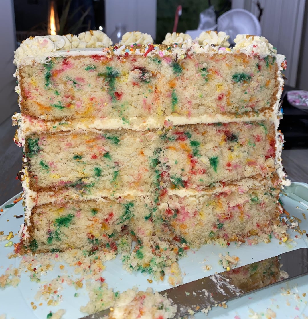 I think the layers of frosting in between are too thin, and the bleeding sprinkles in the batter don’t make it look too appetizing. If you used the sprinkles that look like little rods it typically tends to do that. I have done this before with the tiny bead sprinkles and they do not bleed into the cake. I think all in all, amazing effort because this is a very uniform cake and the cake layers are nice and even. But I would practice some more before making a business with this!