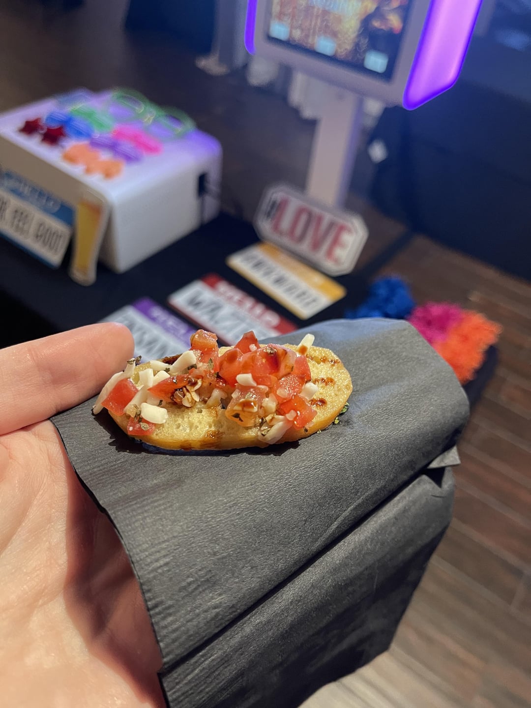 What would you guess for this cheesy vegetable pasta, small crab cake, and mini bruschetta?