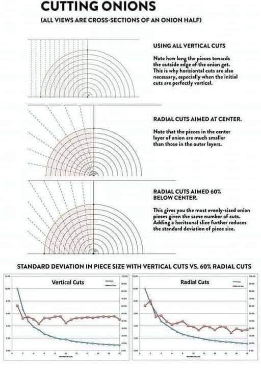 ideal onion cuts for even chunks by NewAlexandria 4 Comments ProperPerspective571 11 months ago Yeh, I’m not breaking out my kid’s protractor when I slice an onion Redyellowredred 11 months ago Onion math. Onion. Math. The two things that make me cry. PlanRevolutionary464 11 months ago Basically, feathering the onion (sorry if not proper name, english is my 2nd language). CertifiedBiogirl 11 months ago Yeah I’m not doing this lolEdit: I barely get paid a living wage so excuse me if I don’t wanna do all this extra shit lolWrite A CommentYou must be logged in to post a comment.