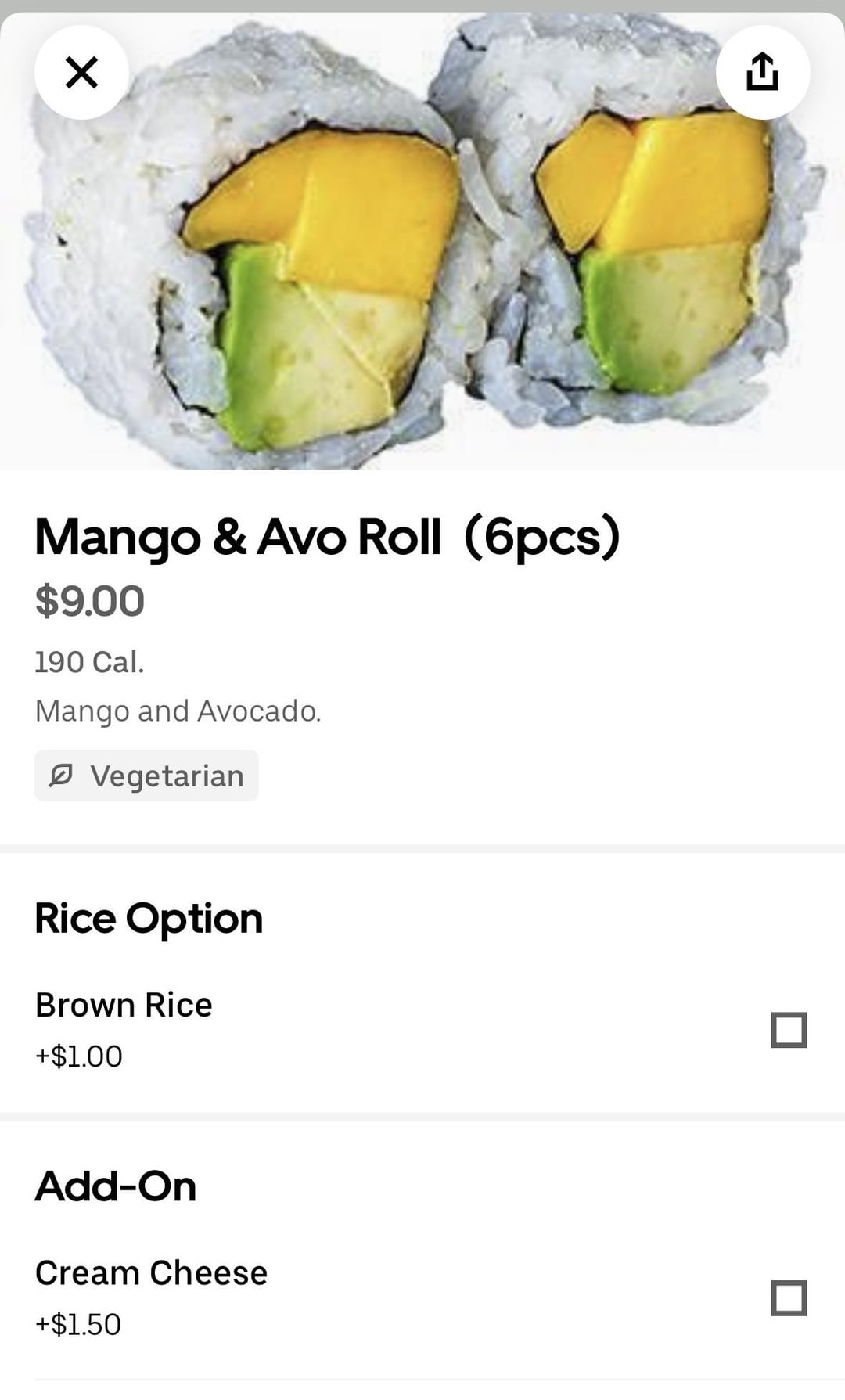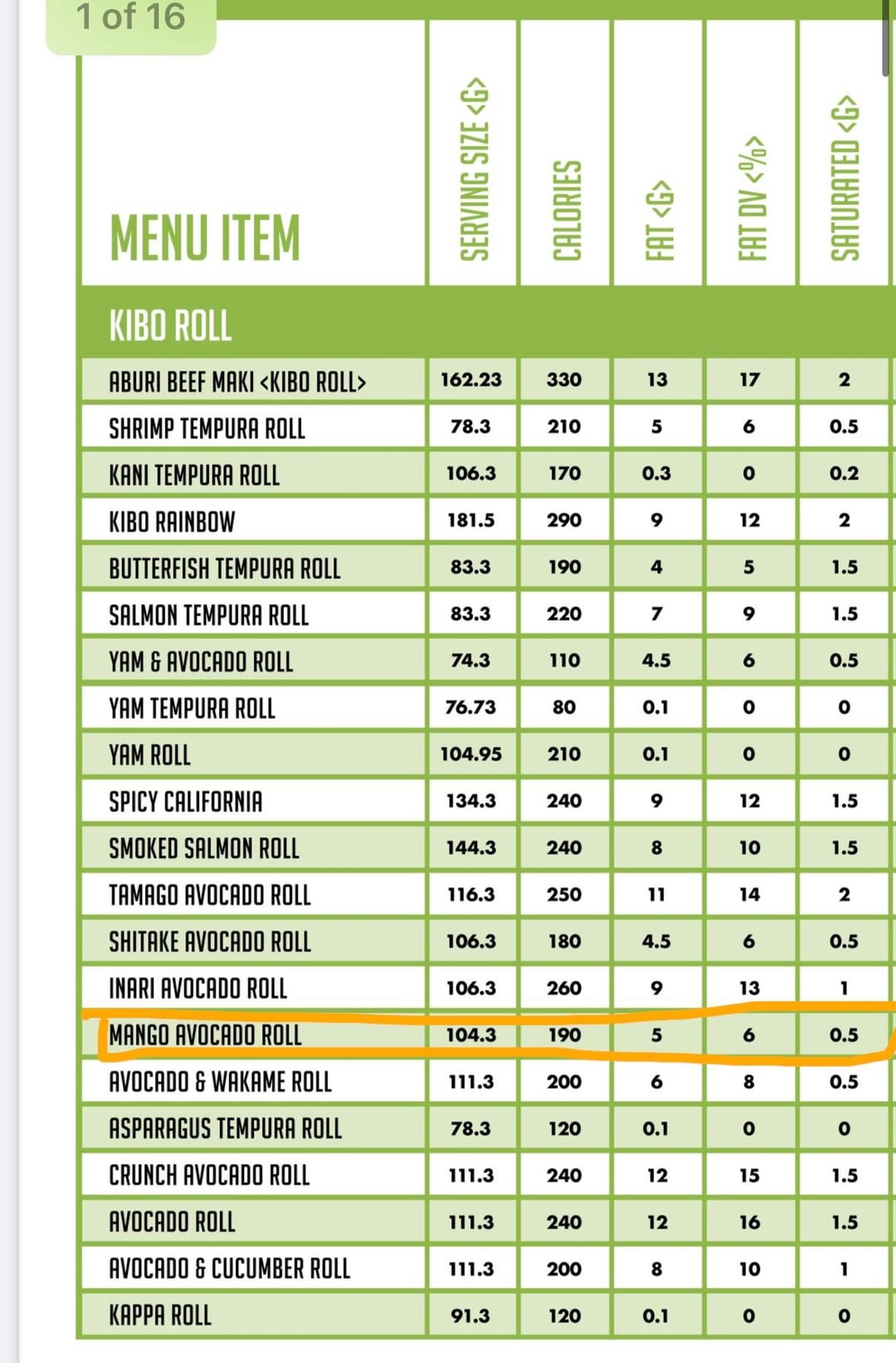 (While this isn’t the only roll I’ll be eating) I’m using the avocado mango roll as an example. I attached what the nutrition guide says (190 cals for 104grams) but then the full serving just says 6 pieces.